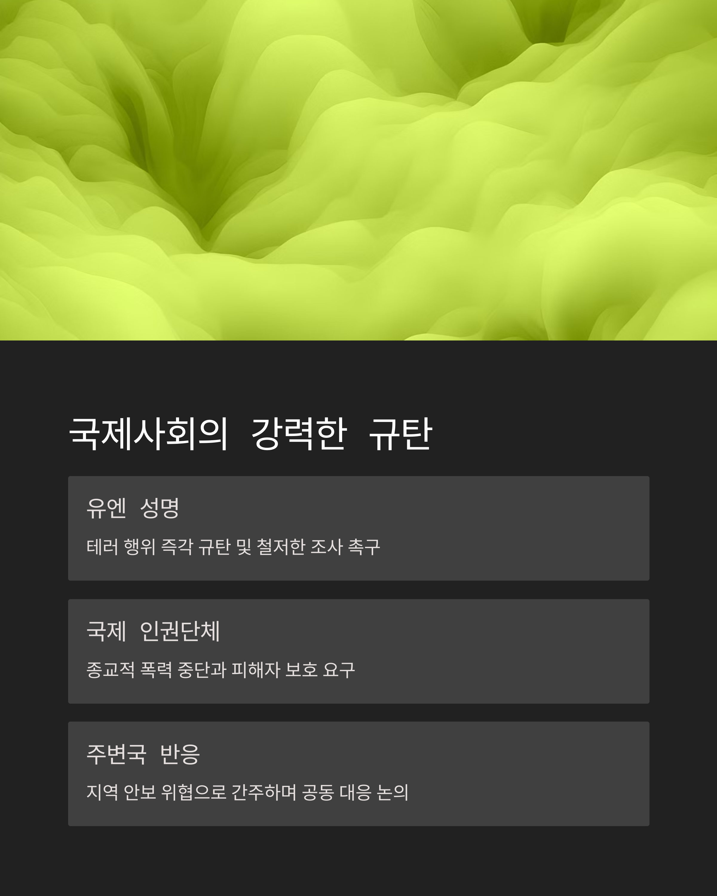 2025년, 우리는 또 하나의 잊지 말아야 할 비극을 목격했습니다. 단지 종교를 강요받았다는 이유로 사람의 생명을 앗아간 이번 사건은, 특정 국가나 종교를 넘어서 전 인류가 함께 고민해야 할 문제라고 생각합니다. 독자 여러분은 어떤 생각이 드셨나요? 댓글로 생각을 나눠주시면 좋겠어요. 그리고 이 이야기를 꼭 주변 사람들과 함께 이야기해 주세요. 기억하고, 다시는 반복되지 않도록 하기 위해서요.