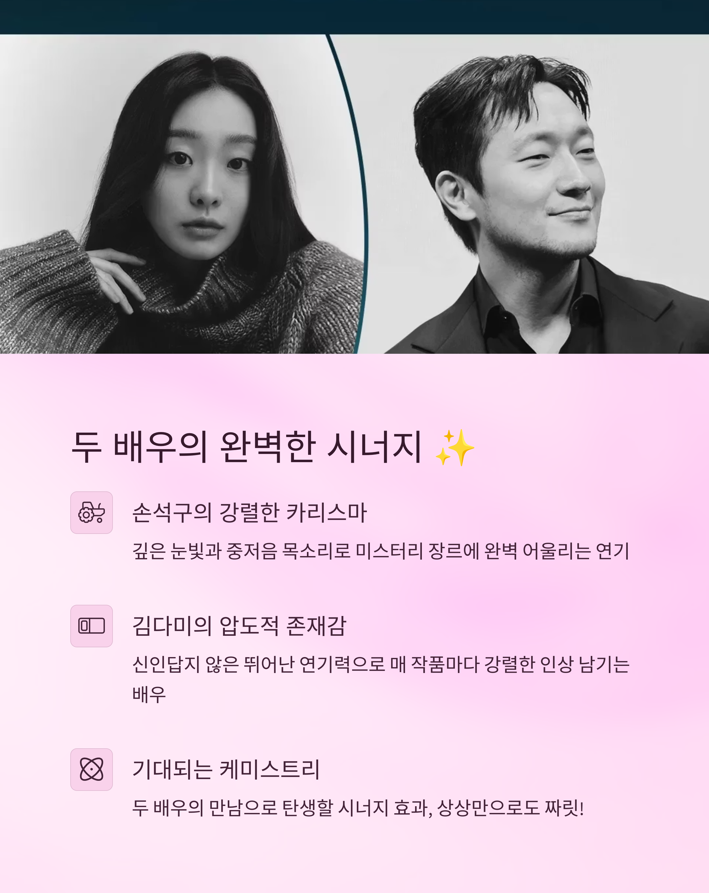 - 손석구 배우: 매번 새로운 캐릭터로 변신하며 연기 스펙트럼을 넓히는 배우죠. 이번에는 어떤 미스터리한 인물로 우리를 깜짝 놀라게 할지 정말 기대됩니다. 특히 그의 특유의 깊은 눈빛과 중저음 목소리는 미스터리 장르에 완벽하게 어울릴 것 같아요.