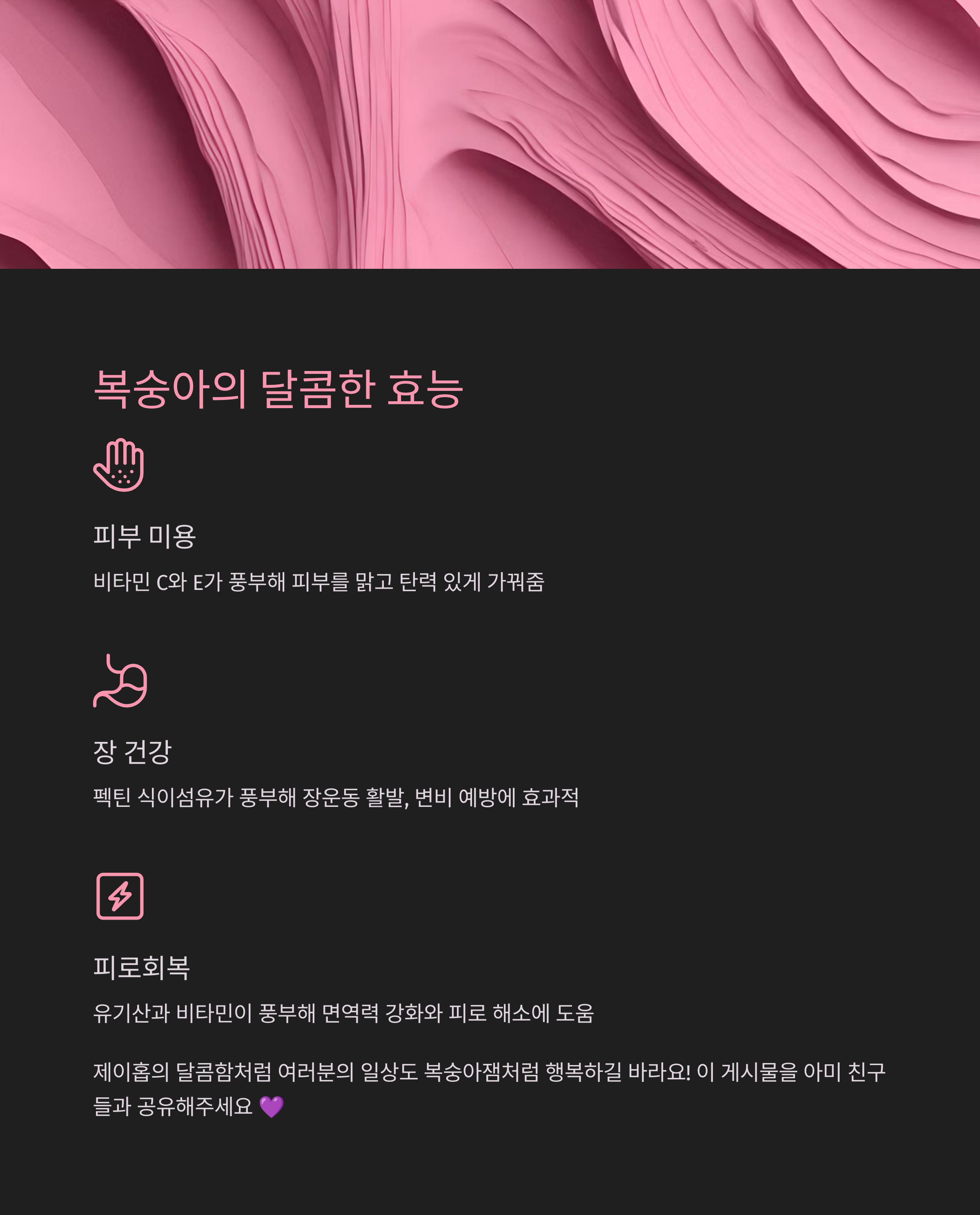 오늘 제이홉의 '복숭아잼' 이야기와 복숭아의 건강 효능까지 알아보는 시간, 어떠셨나요? 저도 이 글을 쓰면서 제이홉의 따뜻한 마음과 복숭아의 달콤함에 푹 빠져버렸답니다! 여러분의 일상에도 제이홉의 '복숭아잼'처럼 달콤하고 행복한 순간들이 가득하길 바라요. 혹시 여러분만의 복숭아 레시피나 제이홉 복숭아잼에 얽힌 추억이 있다면 댓글로 나눠주세요~ 😊
