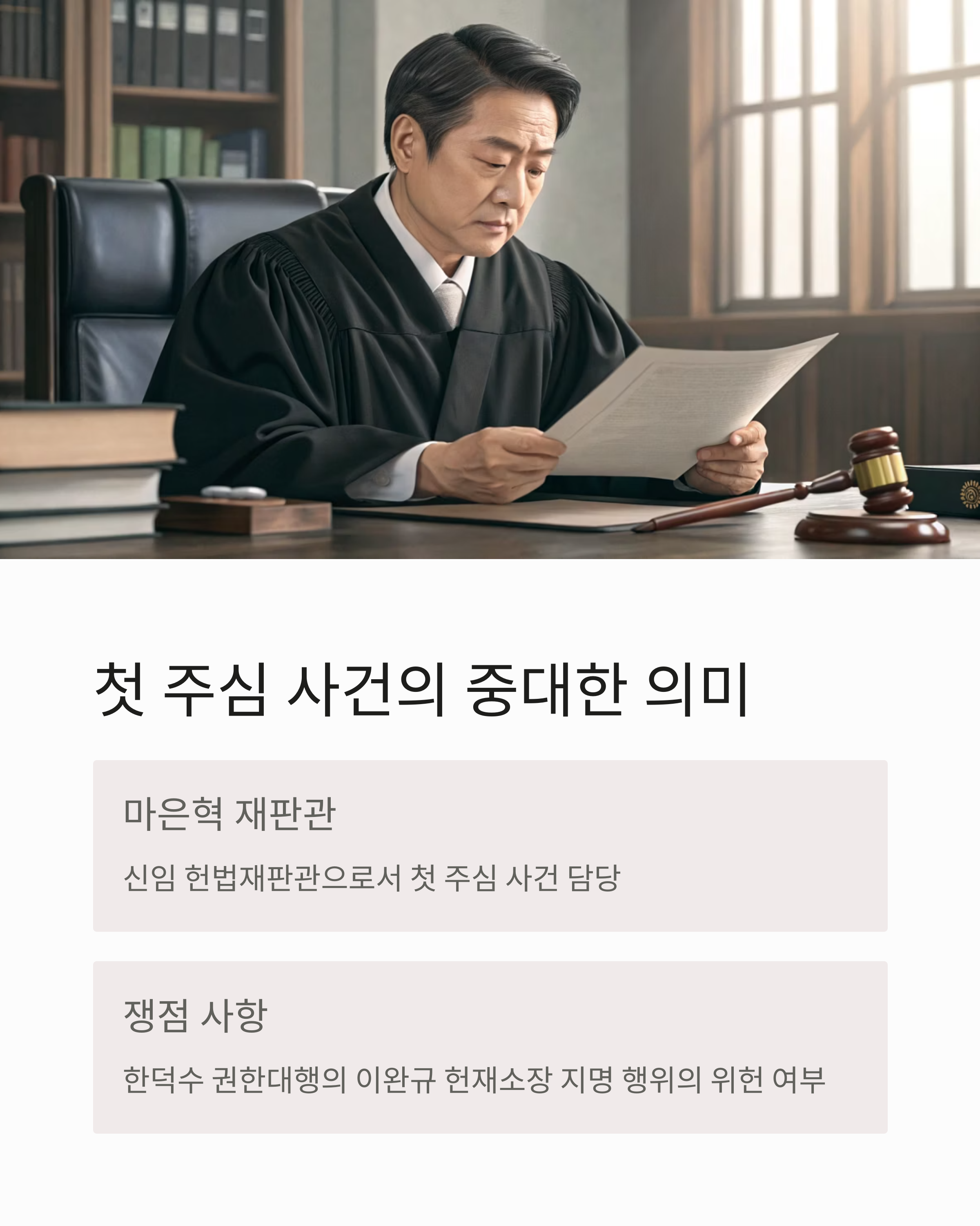 2025년 3월, 대통령 궐위 상태에서 국무총리 한덕수가 대통령 권한대행 직무를 수행하던 중 이완규 후보자를 헌법재판소장으로 지명하면서 시작된 사건입니다. 이에 대해 야당과 일부 시민단체는 대통령만이 가질 수 있는 헌재소장 지명권을 권한대행이 행사한 것이 헌법 위반 소지가 있다며 위헌 확인 헌법소원을 제기했죠. 그리고 이 사건을 처음 맡은 주심이 바로 새로 임명된 마은혁 헌법재판관이라는 점이 주목받고 있습니다.