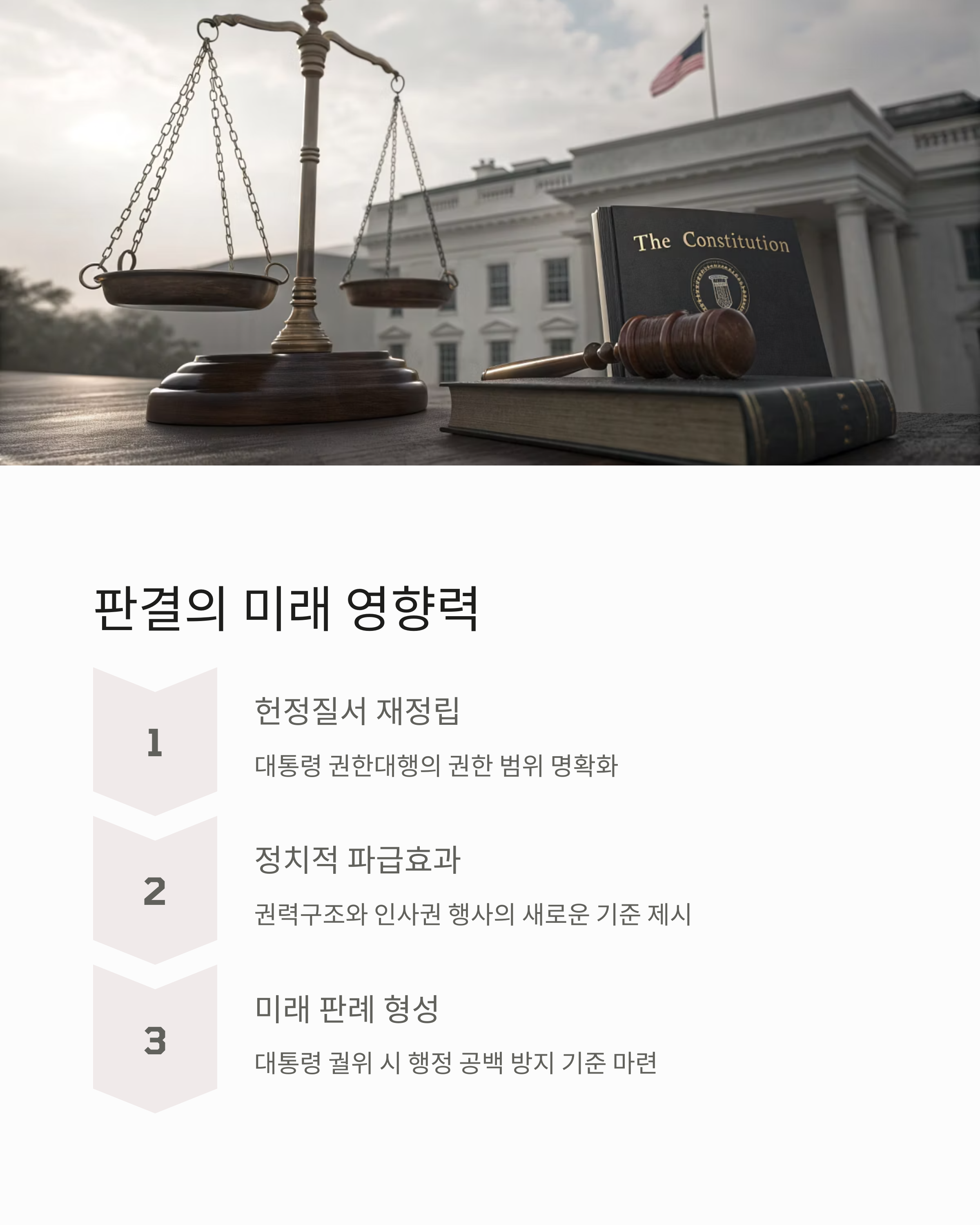 헌재가 어떤 결론을 내리든, 이번 사건은 향후 권한대행 체제에서의 권한 행사 기준을 명확히 하는 판례가 될 것입니다. 특히 헌법기관장의 임명권은 향후 유사 상황에서 중요한 기준점이 될 것이며, 헌정질서의 안정성과도 직결된다는 점에서 헌법 사상 매우 중요한 이정표로 남을 수 있습니다.