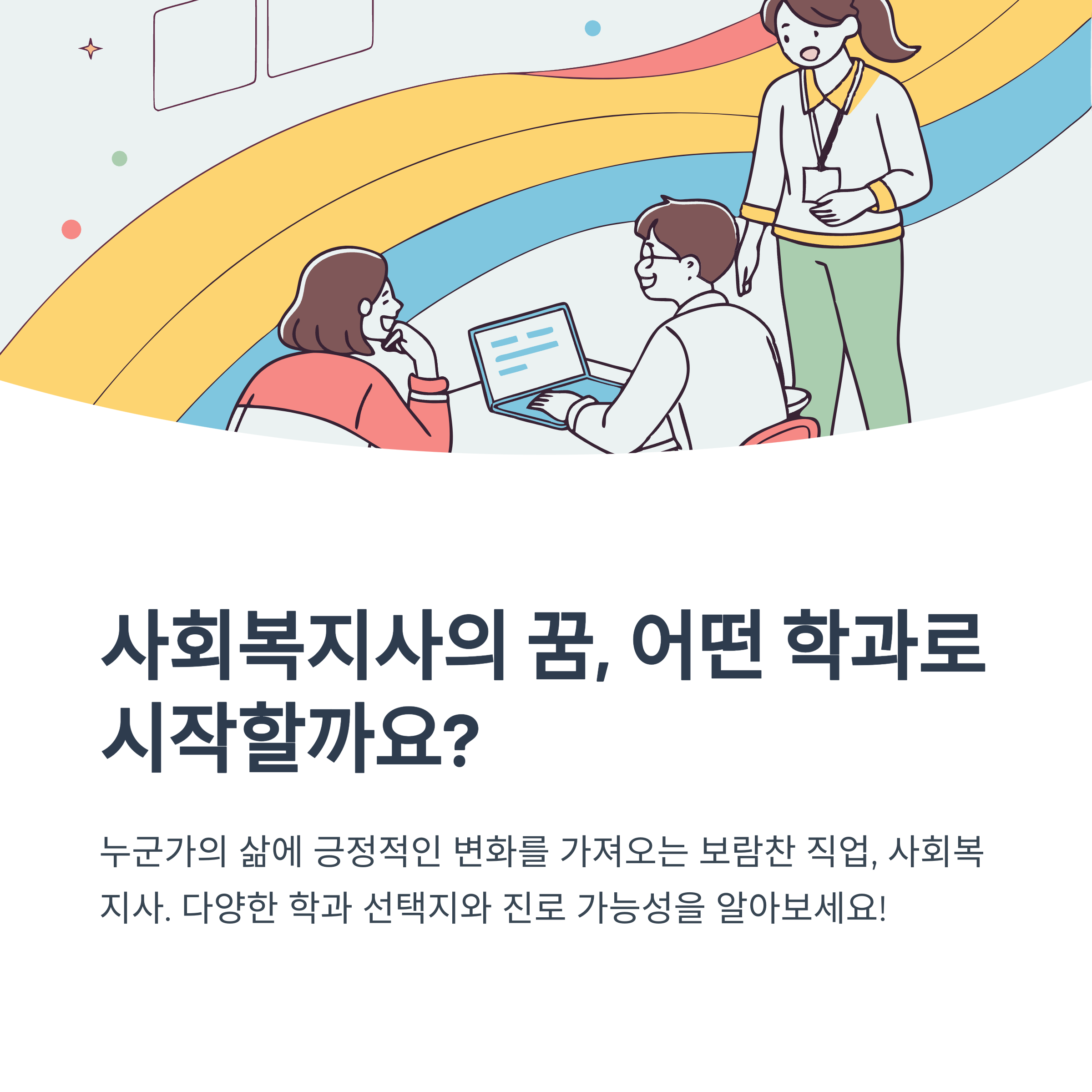 사회복지사의 길을 걷고자 하는 여러분을 위해, 사회복지 관련 학과 선택부터 필요한 역량까지 핵심 내용을 요약해 봤어요!