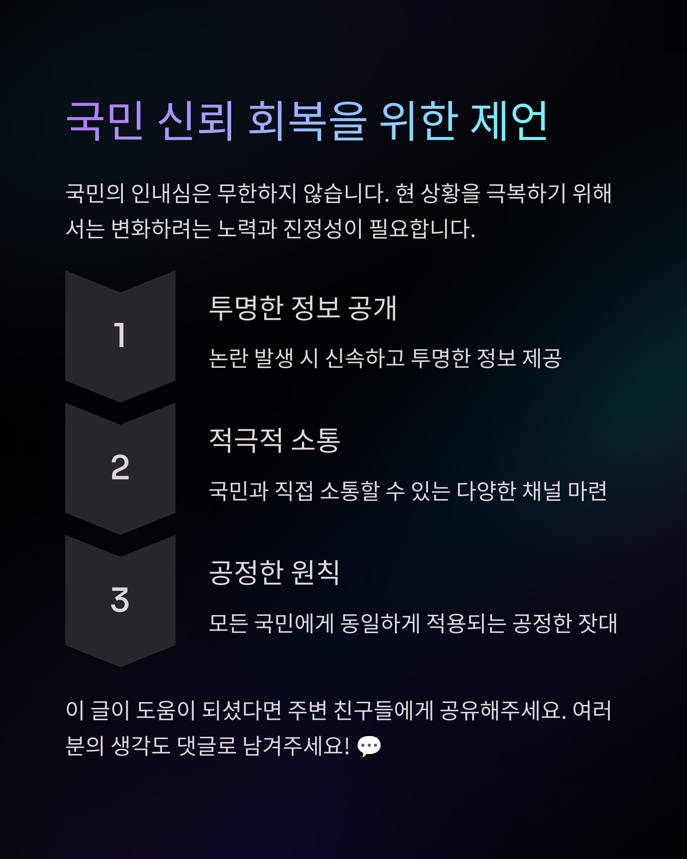 4. 미래를 위한 제언: 투명한 정보 공개, 적극적인 소통, 책임 있는 자세, 공정한 원칙 적용을 통해 변화하려는 진정성을 보여야 합니다.