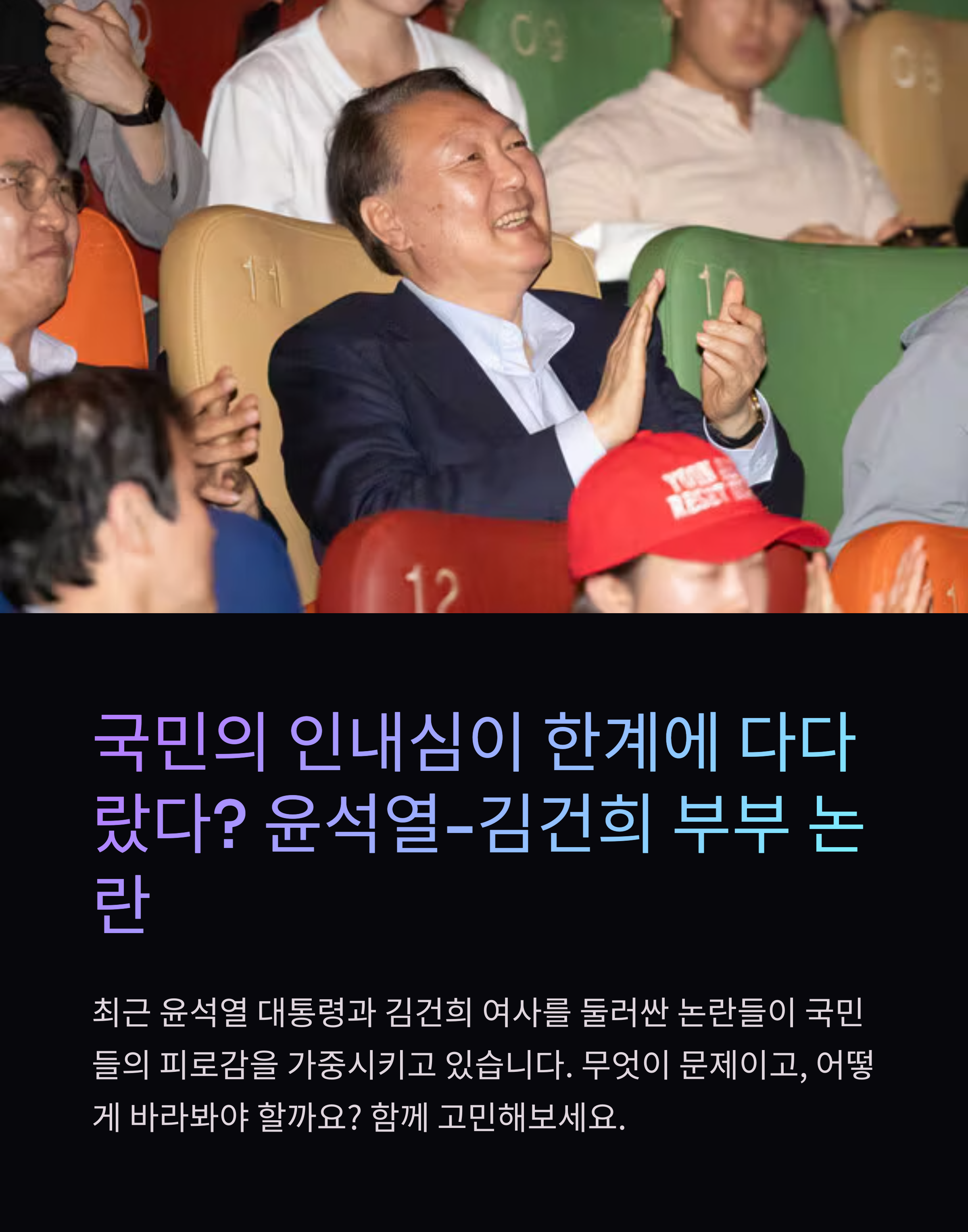 "국민의 인내심은 한계에 다다랐다?" 최근 윤석열-김건희 부부를 둘러싼 논란들이 국민들의 피로감을 가중시키고 있습니다. 과연 무엇이 문제이고, 우리는 이 상황을 어떻게 바라봐야 할까요? 함께 고민해보고자 합니다.