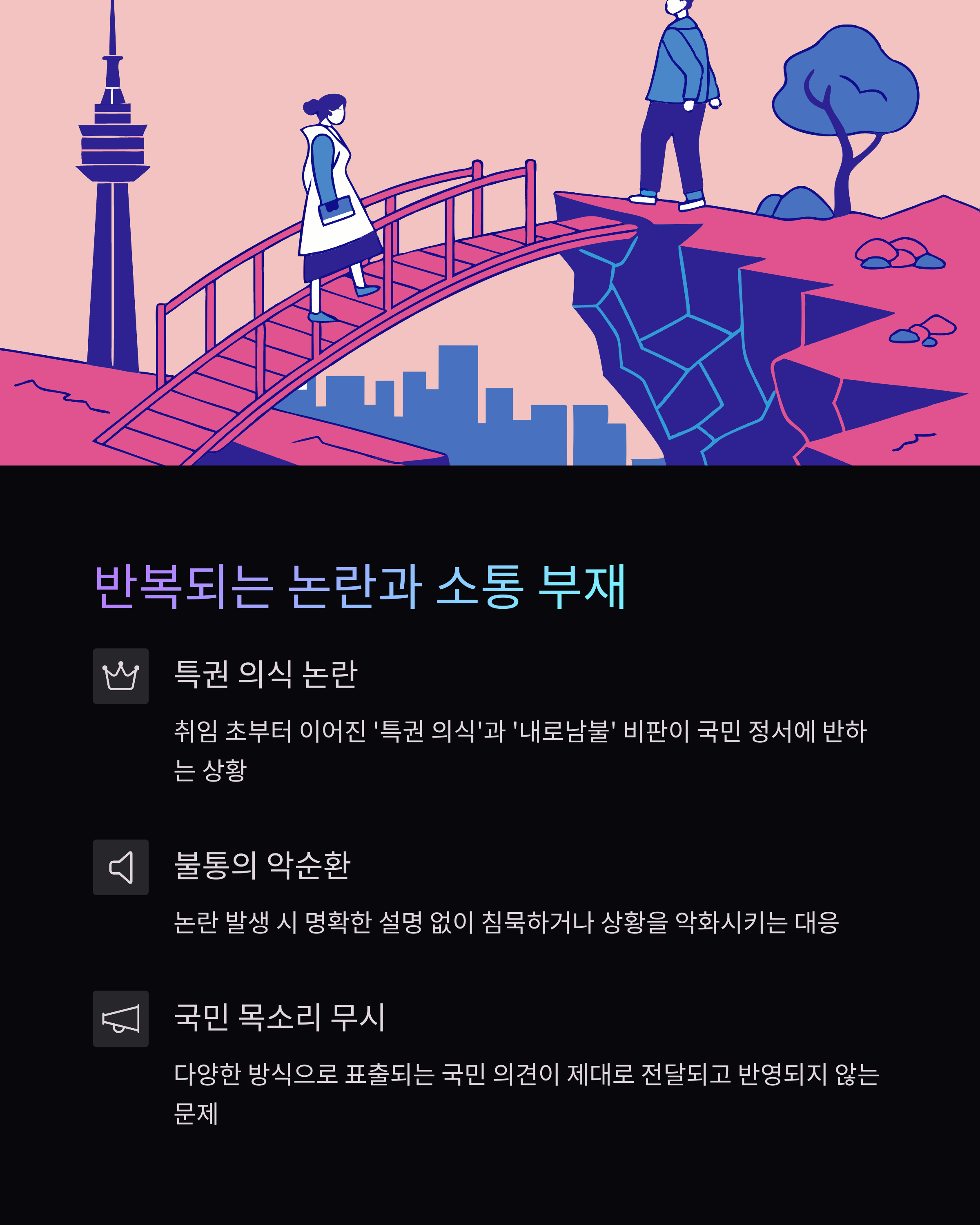 제가 보기에 또 다른 심각한 문제는 바로 소통의 문제입니다. 논란이 불거질 때마다 명확한 설명이나 책임 있는 대응보다는 침묵하거나, 오히려 상황을 악화시키는 듯한 반응이 자주 목격되었어요. 이런 불통의 모습은 국민들의 답답함을 극대화하고, 의혹을 더욱 증폭시키는 결과를 낳는 것 같아요.