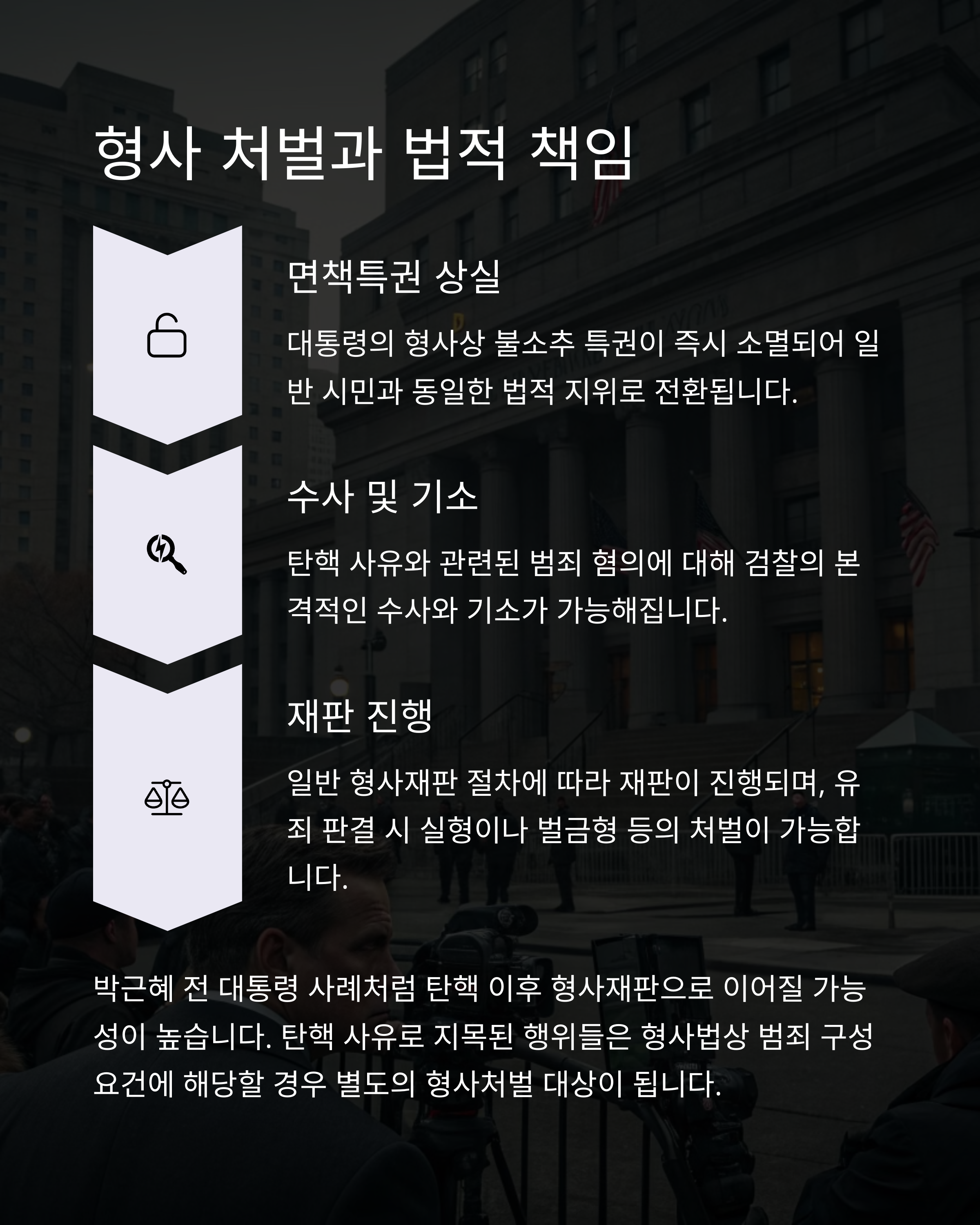대통령이 탄핵으로 파면되면 단순히 자리에서 물러나는 것 이상의 후폭풍이 따릅니다. 특히 형사적 책임 문제가 수면 위로 올라오게 되죠. 헌법상 재임 중 형사소추가 불가능한 대통령도 탄핵 이후에는 민간인 신분이 되기 때문에, 검찰 수사 및 기소 가능성이 생깁니다. 윤석열 대통령이 검찰총장 출신이라는 점에서, 만약 탄핵 이후 수사에 직면한다면 정치적으로도 법적으로도 큰 파장이 예상됩니다.