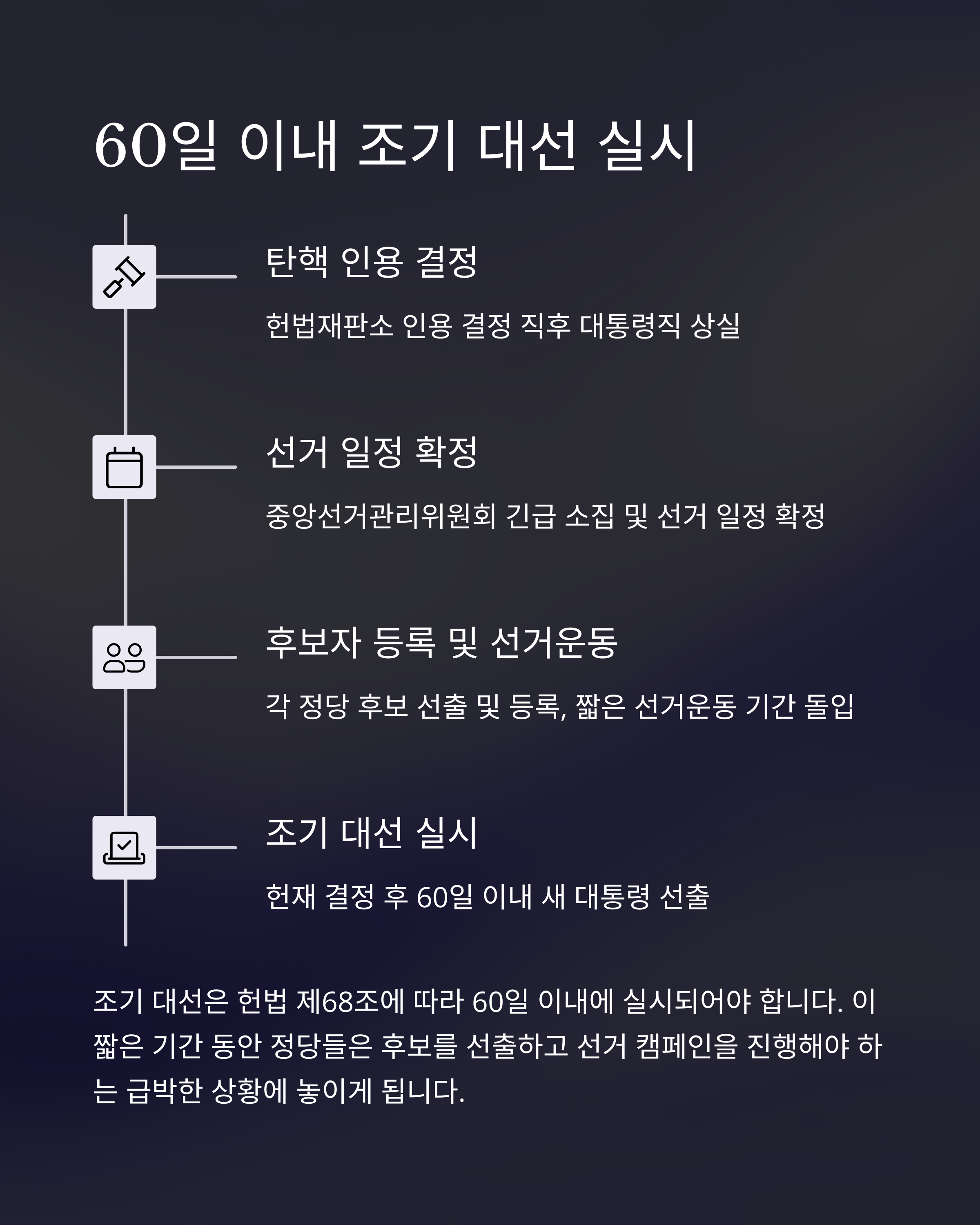 탄핵이 인용되면 대통령은 즉시 직에서 물러나게 되며, 이후 60일 이내에 조기 대통령 선거가 치러져야 합니다. 그럼 대략 어떤 일정이 예상될 수 있을까요?