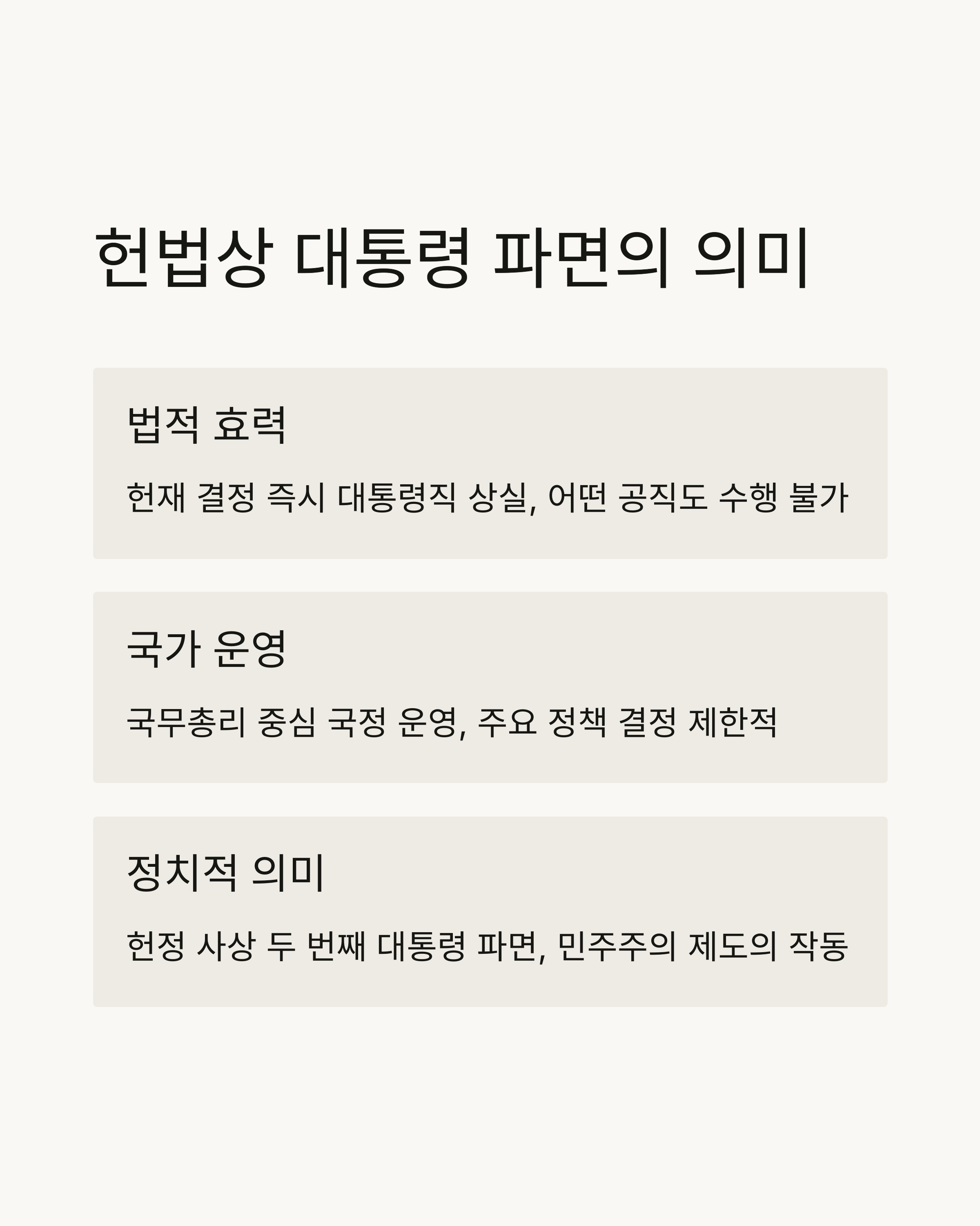 대통령이 파면되면 그 자리는 곧바로 비게 됩니다. 하지만 국정 공백은 있을 수 없죠. 그래서 헌법 제71조에 따라 국무총리가 대통령 권한대행을 맡게 됩니다. 현재 한덕수 총리가 대통령 권한대행 역할을 수행하며, 외교·국방·경제 등 주요 국정을 임시로 이끌게 됩니다. 다만, 권한대행은 정책 추진력은 떨어지고, 인사권도 제한되는 경우가 많아 안정성은 확보되지만 역동성은 낮다고 볼 수 있어요.