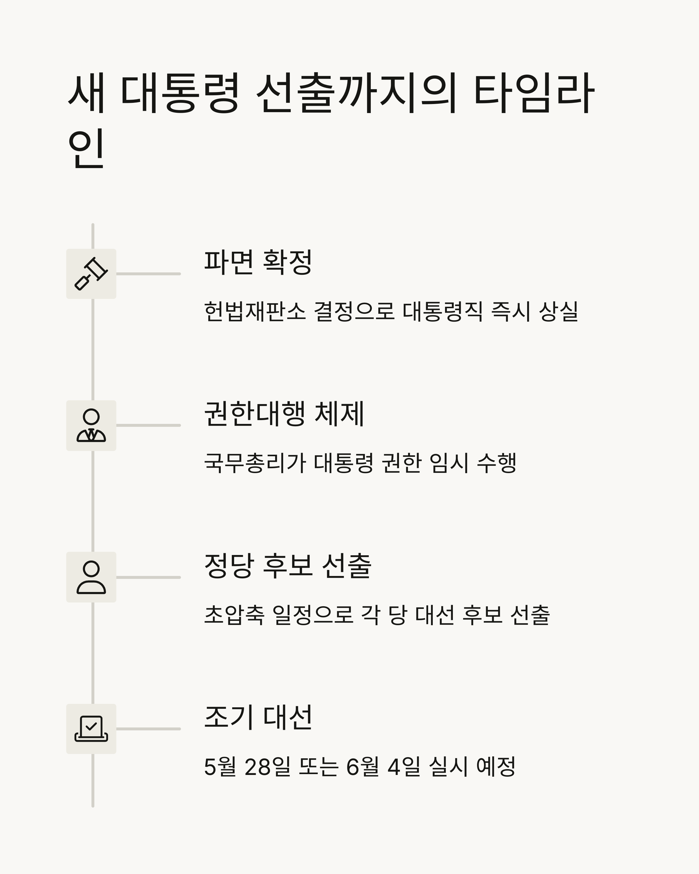탄핵 인용이 결정된 이후, 대통령 선거까지의 시간표는 아주 빡빡하게 돌아갑니다. 중앙선거관리위원회는 최대한 신속하게 공고를 내고, 정당들은 후보 등록과 공천에 박차를 가하죠.
