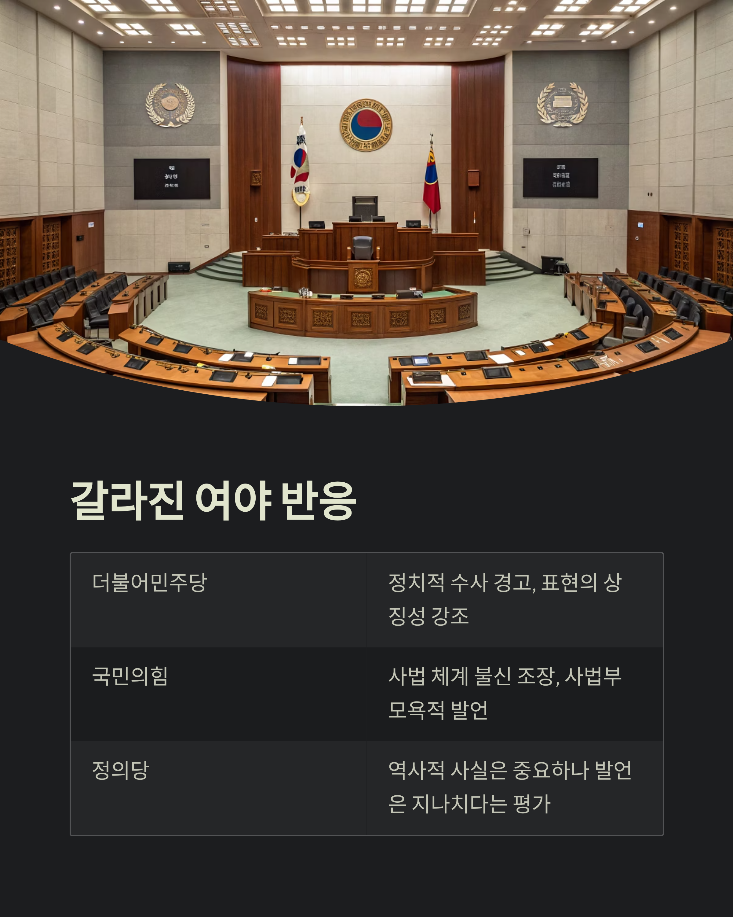 | 정의당 | 역사적 사실은 중요하나 발언은 지나치다는 평가 |