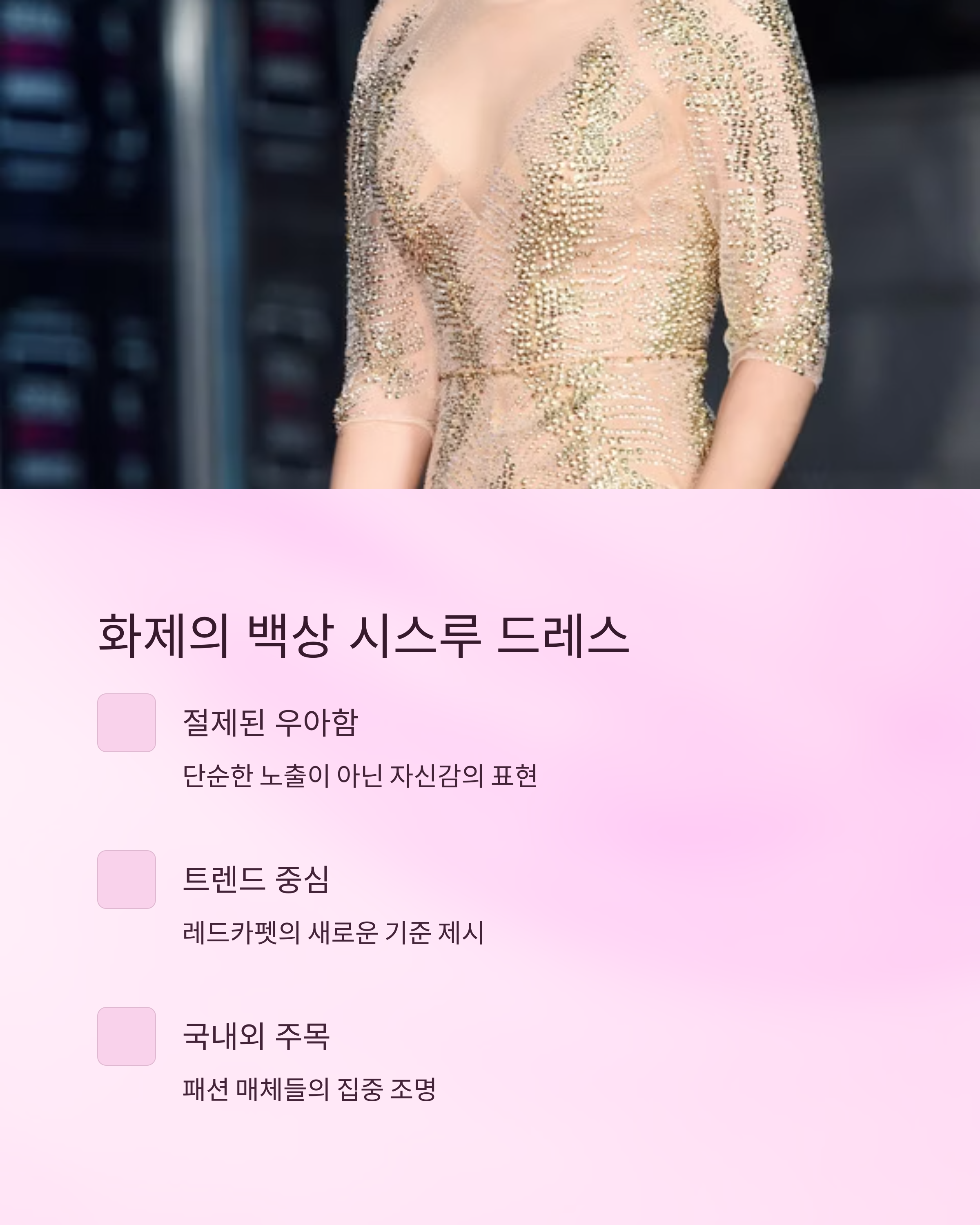 2025년 백상예술대상에서 이하늬가 선보인 시스루 드레스는 그야말로 역대급. 단순히 노출이 아닌 절제된 우아함과 자신감의 표현이 조화를 이룬 스타일이었죠. 스타일리스트와 함께 완성한 이 드레스는 레드카펫 트렌드의 중심으로 떠올랐고, 국내외 패션 매체들의 조명을 받았습니다.