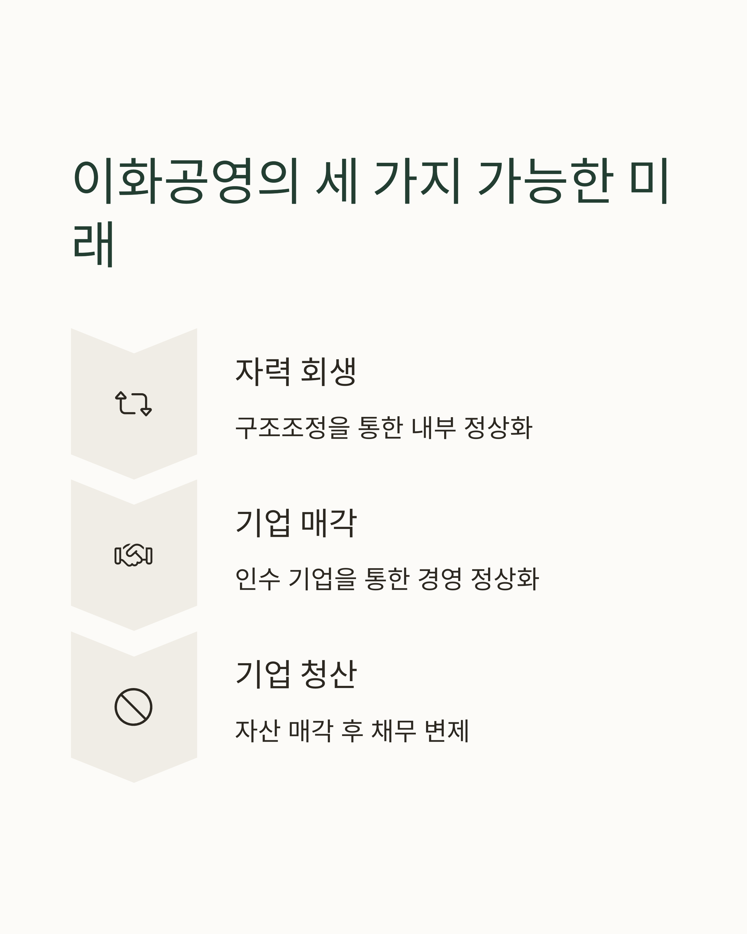 이화공영이 앞으로 어떤 길을 걷게 될지는 아직 불확실하지만, 일반적으로는 다음과 같은 세 가지 시나리오가 예상됩니다. 각 시나리오는 시장 환경, 채권자 협의 여부, 법원 판단 등에 따라 달라질 수 있습니다.