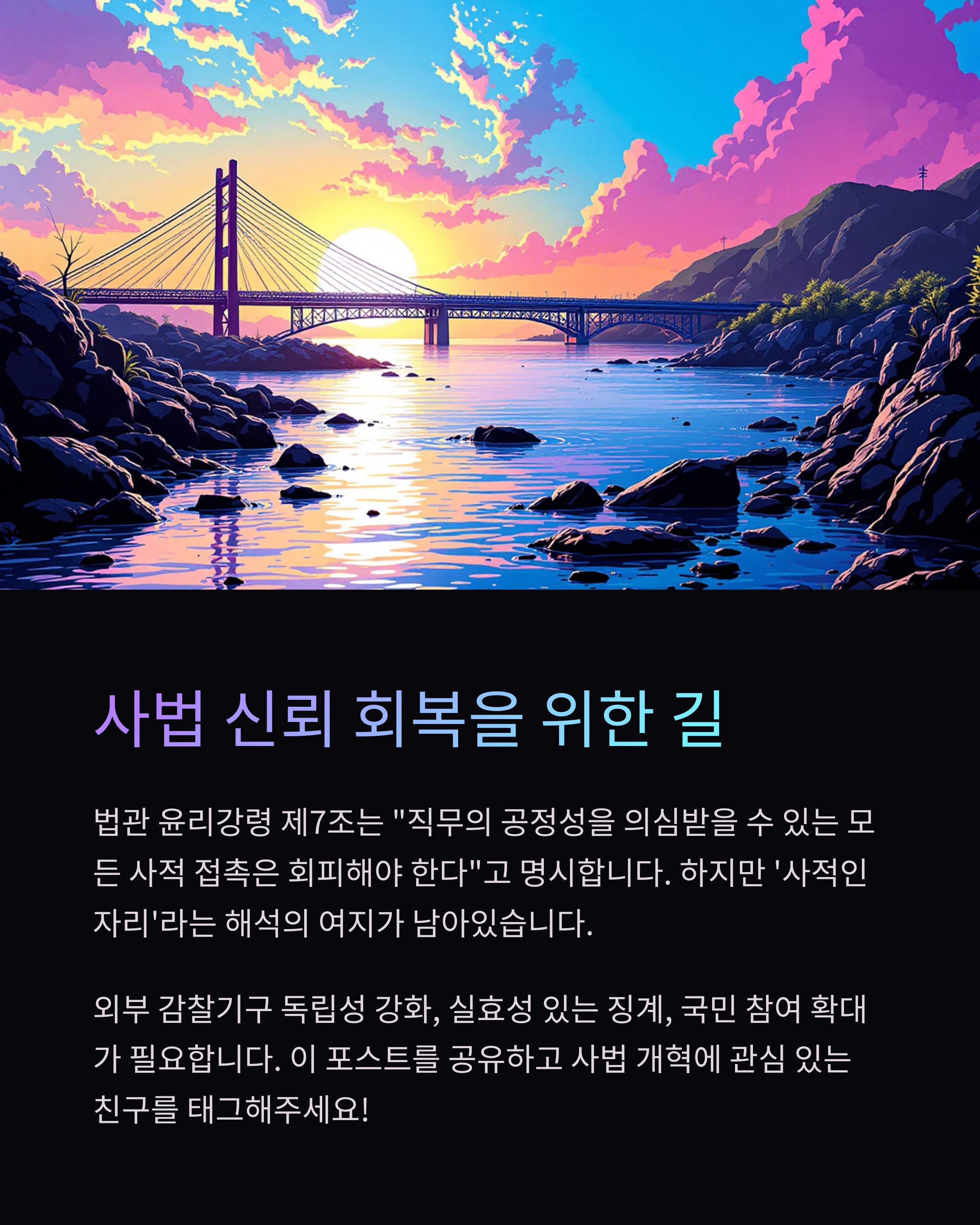 사법 신뢰는 하루아침에 만들어지지 않지만, 한 번 무너지면 회복에 오랜 시간이 걸립니다. 그렇기에 지금부터라도 구조적 개혁과 제도 정비가 필요해요.