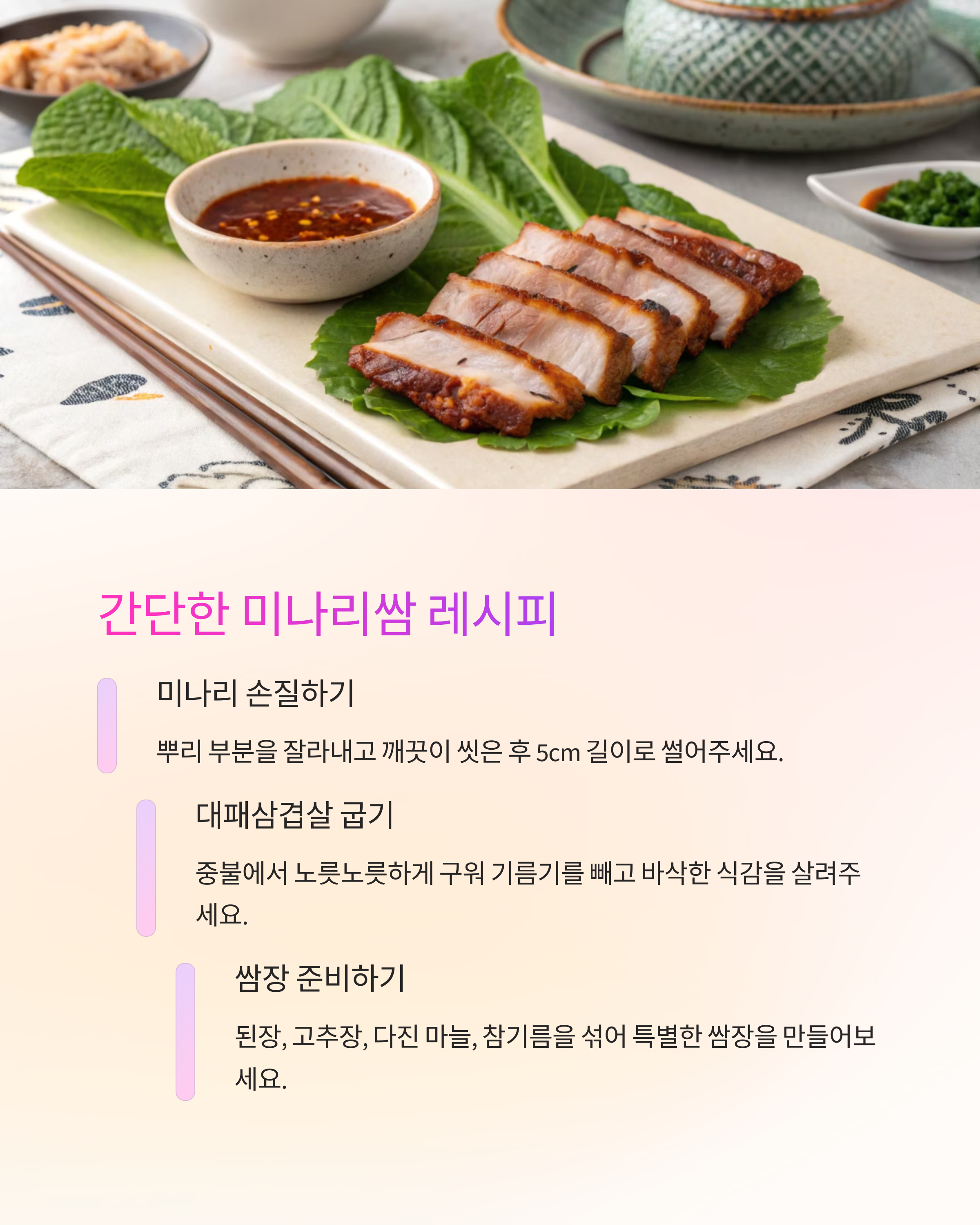 - 미나리는 오래 익히지 말고, 생으로 먹는 게 향이 더 좋음!