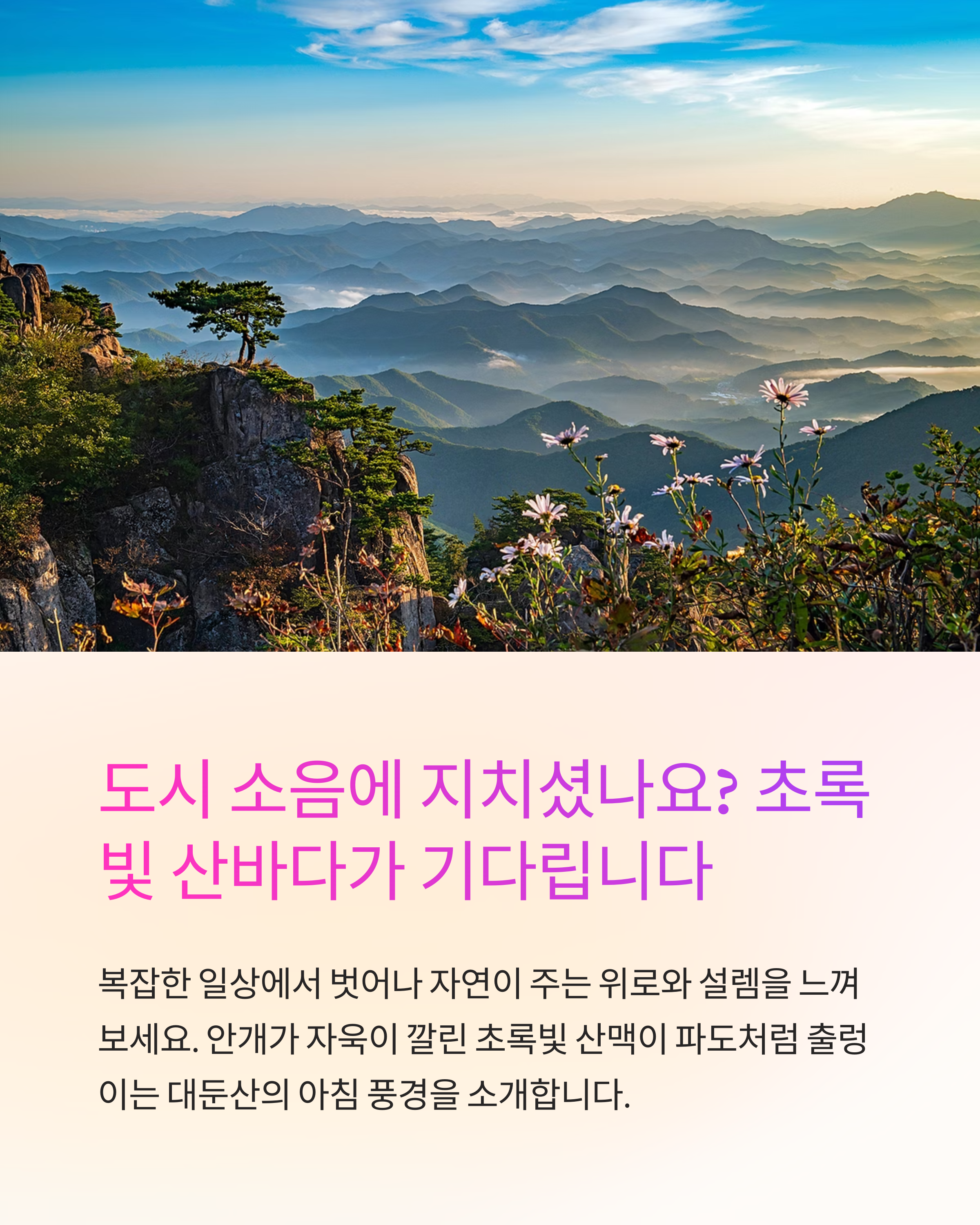 혹시 요즘, 도시의 소음과 복잡함에 지치셨나요? 초록으로 물든 산들이 바다처럼 펼쳐지는 그 풍경, 직접 느껴본 적 있으신가요?