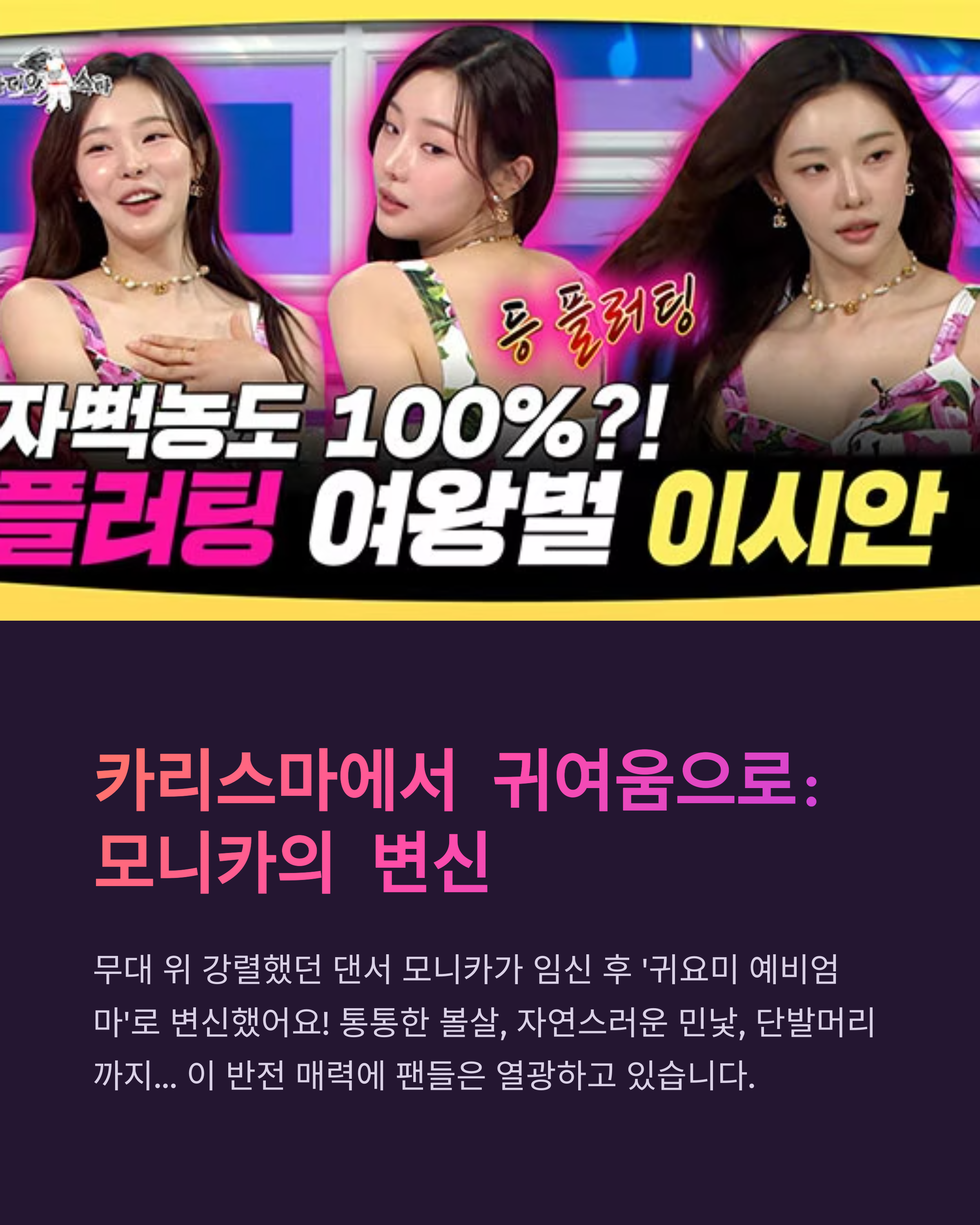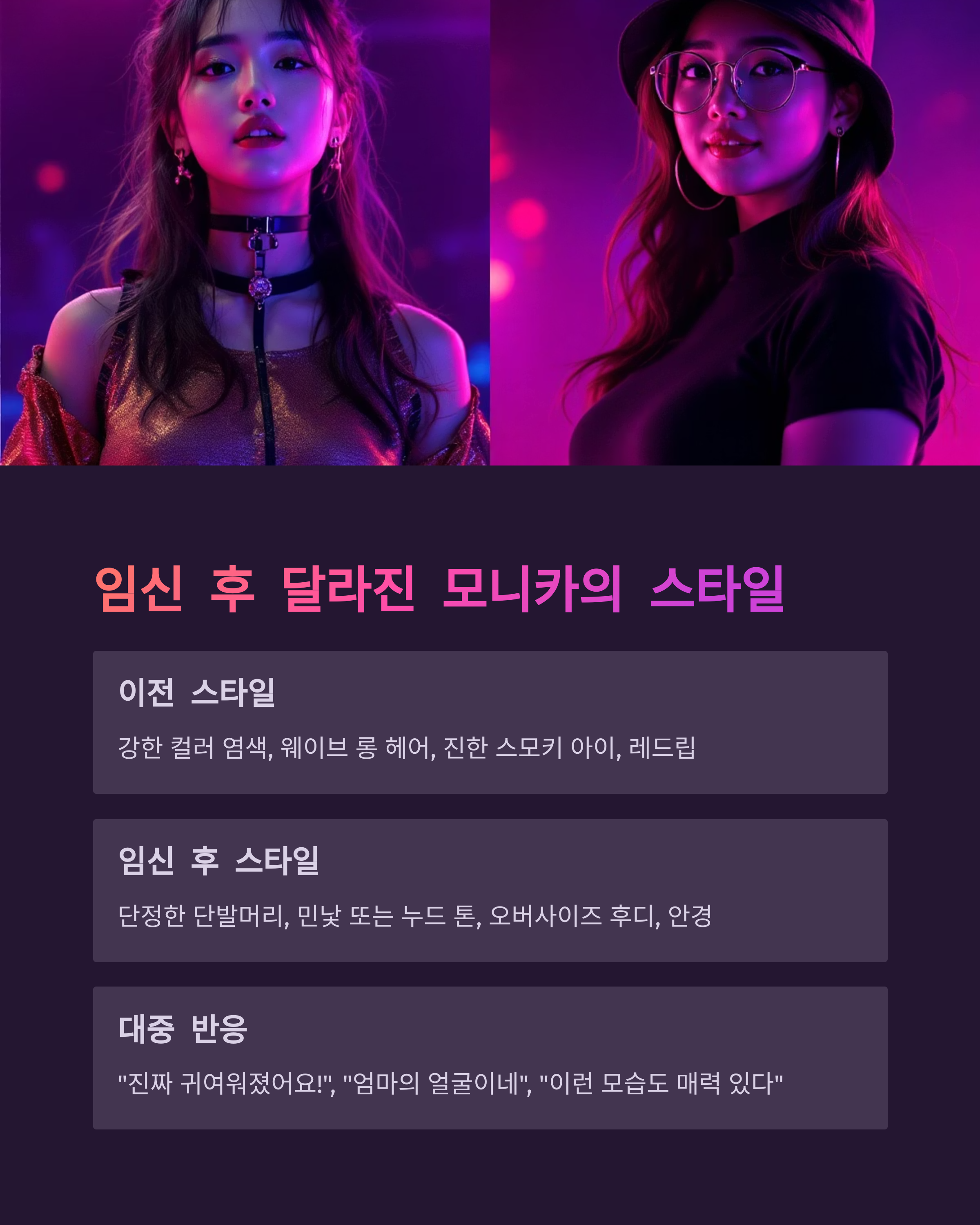 모니카님 하면 딱 떠오르는 이미지가 있잖아요? 강렬한 눈빛, 날카로운 턱선, 그리고 몸의 라인을 그대로 드러내는 파워풀한 의상들! 무대 위에서는 정말 범접할 수 없는 아우라를 뿜어냈었죠. 그런데 임신 후에는 확실히 달라졌더라고요.