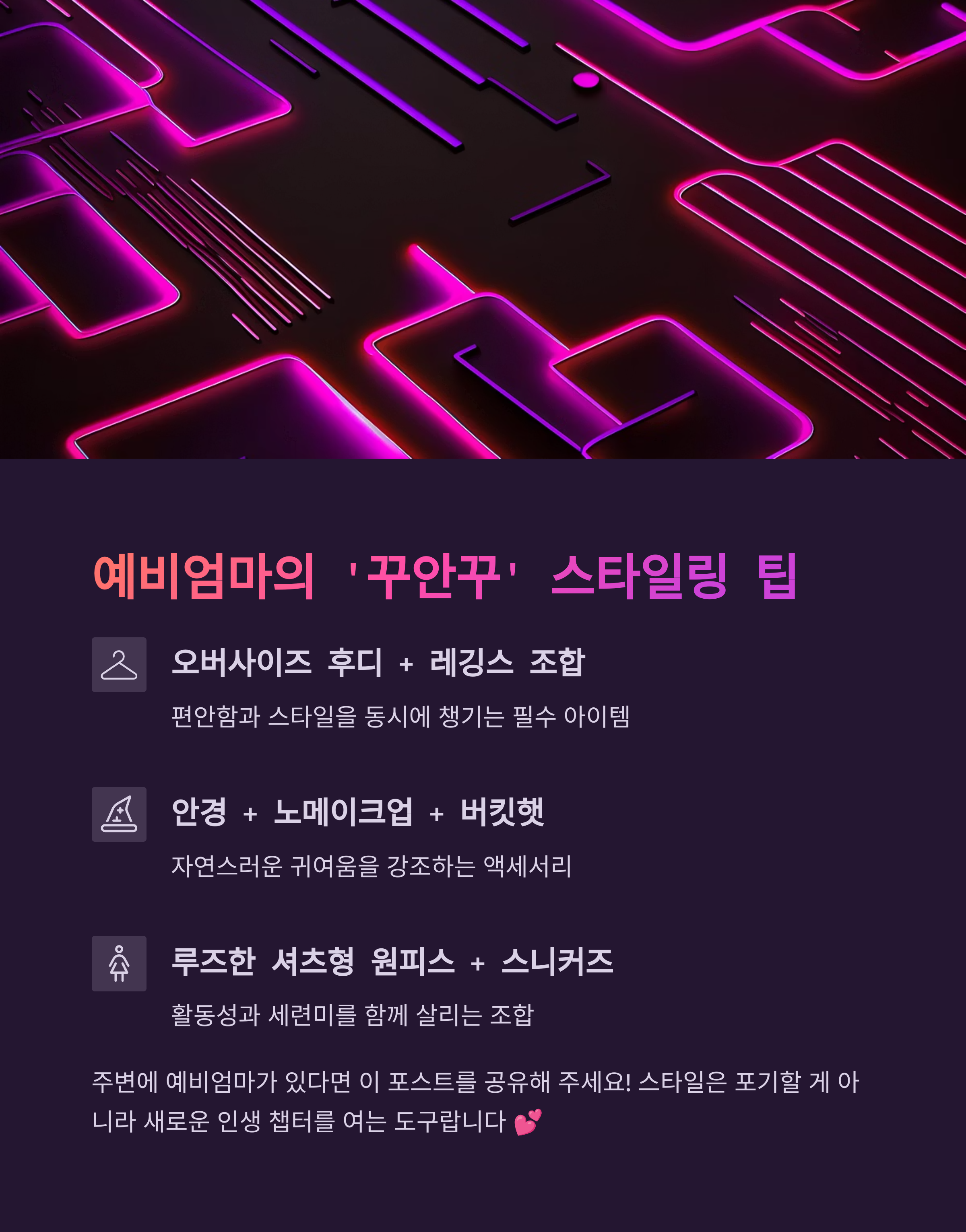 사실 임신 기간은 몸도 마음도 예민해지기 쉬운 때인데, 모니카님처럼 자신을 사랑하고 가꾸는 모습을 보여주는 게 많은 예비 엄마들에게 큰 용기가 될 것 같아요. 굳이 비싼 옷을 사지 않아도, 지금 가지고 있는 옷들을 활용해서 편안하면서도 나를 표현하는 스타일을 찾는 게 중요하다고 생각해요.