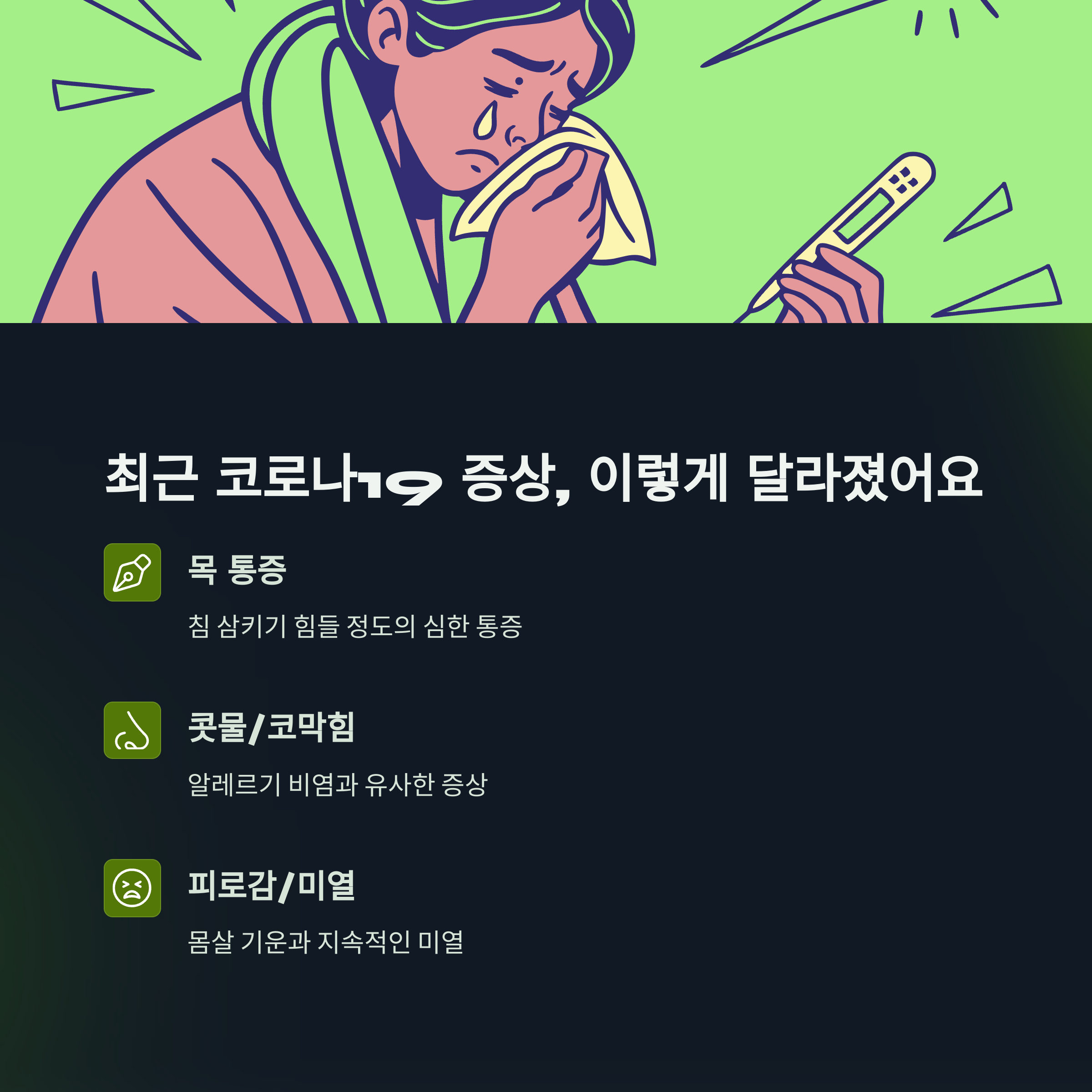 - 주요 증상 변화: 과거 증상보다 목 통증, 콧물/코막힘, 기침, 피로감, 미열 등 감기와 독감 유사 증상이 흔하게 나타납니다.