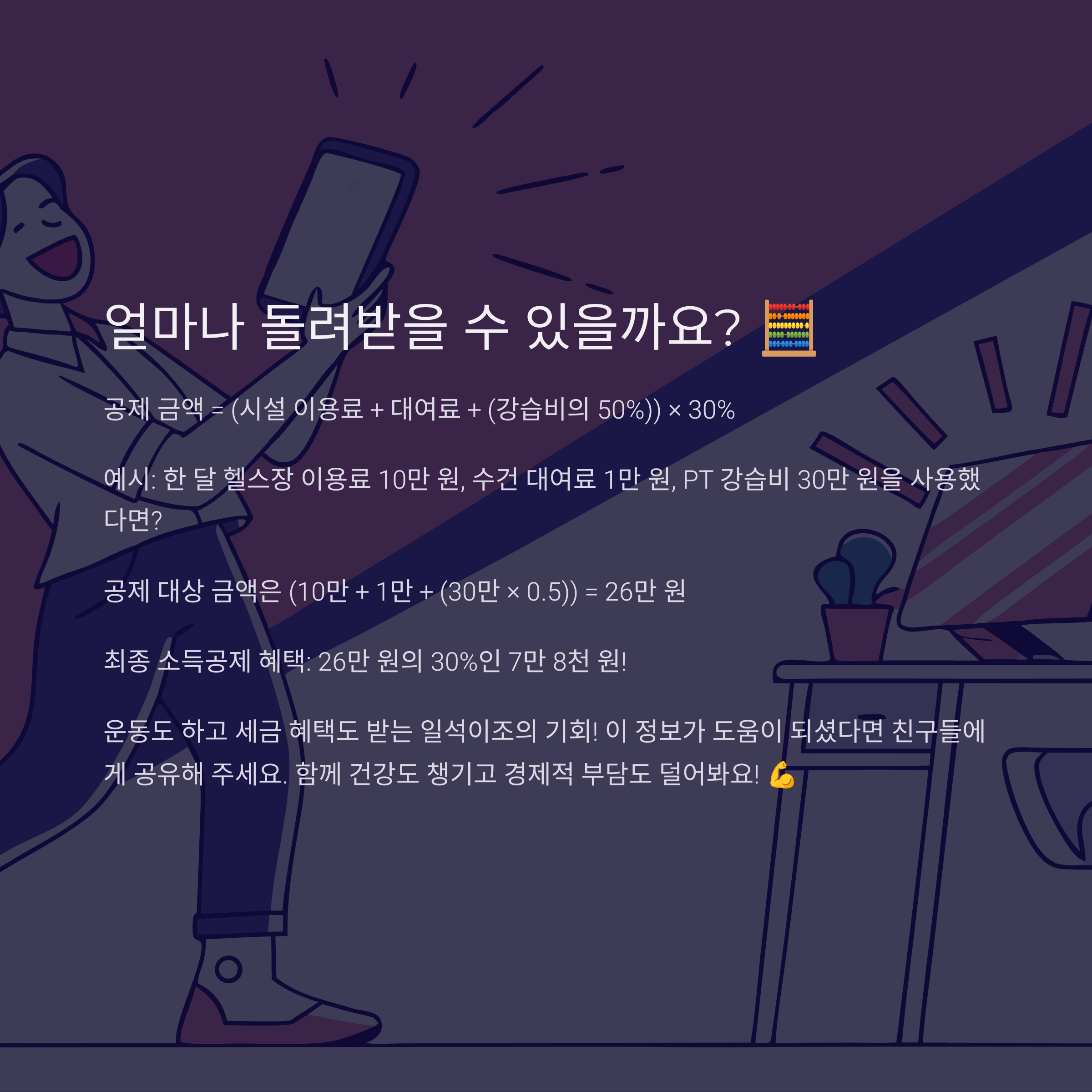 이 사례처럼, 꾸준히 운동하면서 소득공제 혜택까지 챙긴다면 일석이조의 효과를 누릴 수 있겠죠? 저도 운동 등록하러 가야겠어요!