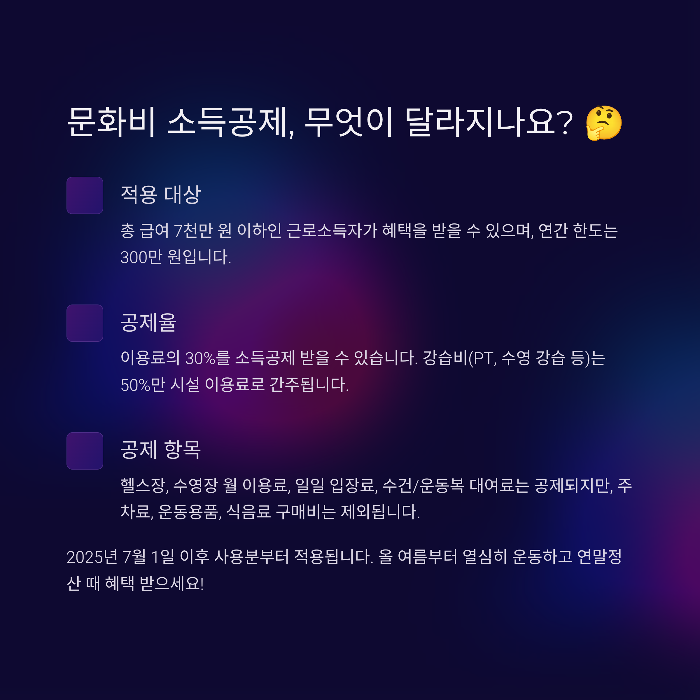 - 시행 시기: 2025년 7월 1일부터 헬스장, 수영장 이용료가 문화비 소득공제 대상에 포함됩니다.