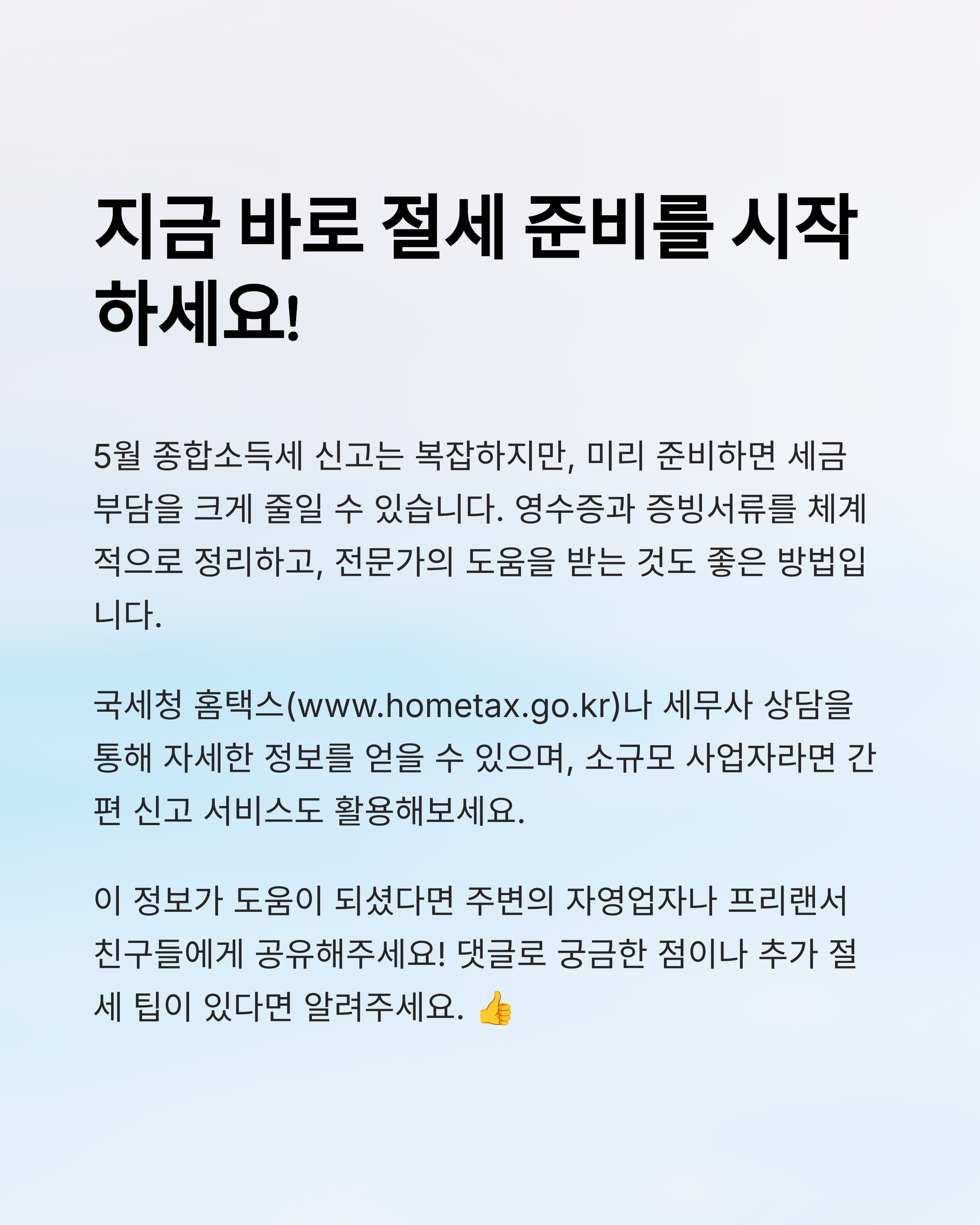 자영업자, 프리랜서, 개인사업자라면 매년 5월이 가장 중요한 달이죠. 매출은 열심히 올렸는데 세금 때문에 속상했던 분들 많으셨을 거예요. 이번에는 달라질 수 있어요. 지금부터라도 준비하면 충분히 절세할 수 있습니다. 오늘 내용이 도움이 되셨다면 댓글이나 공유 한 번 부탁드릴게요! 우리 모두 현명한 납세자가 되어봅시다. 🙂