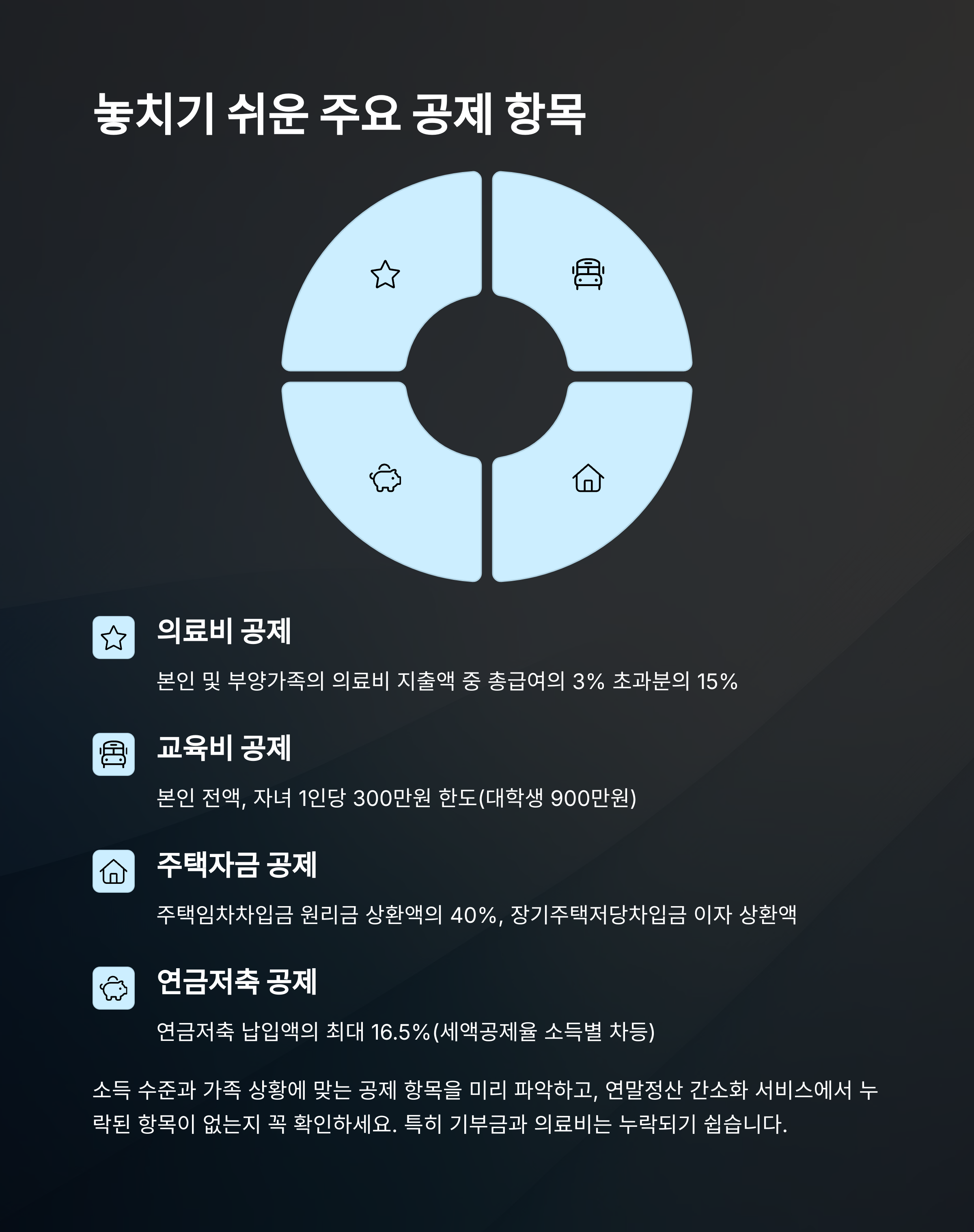 세금을 줄이는 가장 현실적인 방법은 공제 항목을 최대한 활용하는 것입니다. 실제로 제가 놓치고 있다가 뒤늦게 알게 된 항목도 꽤 많았어요. 대표적인 절세 항목은 아래와 같습니다.