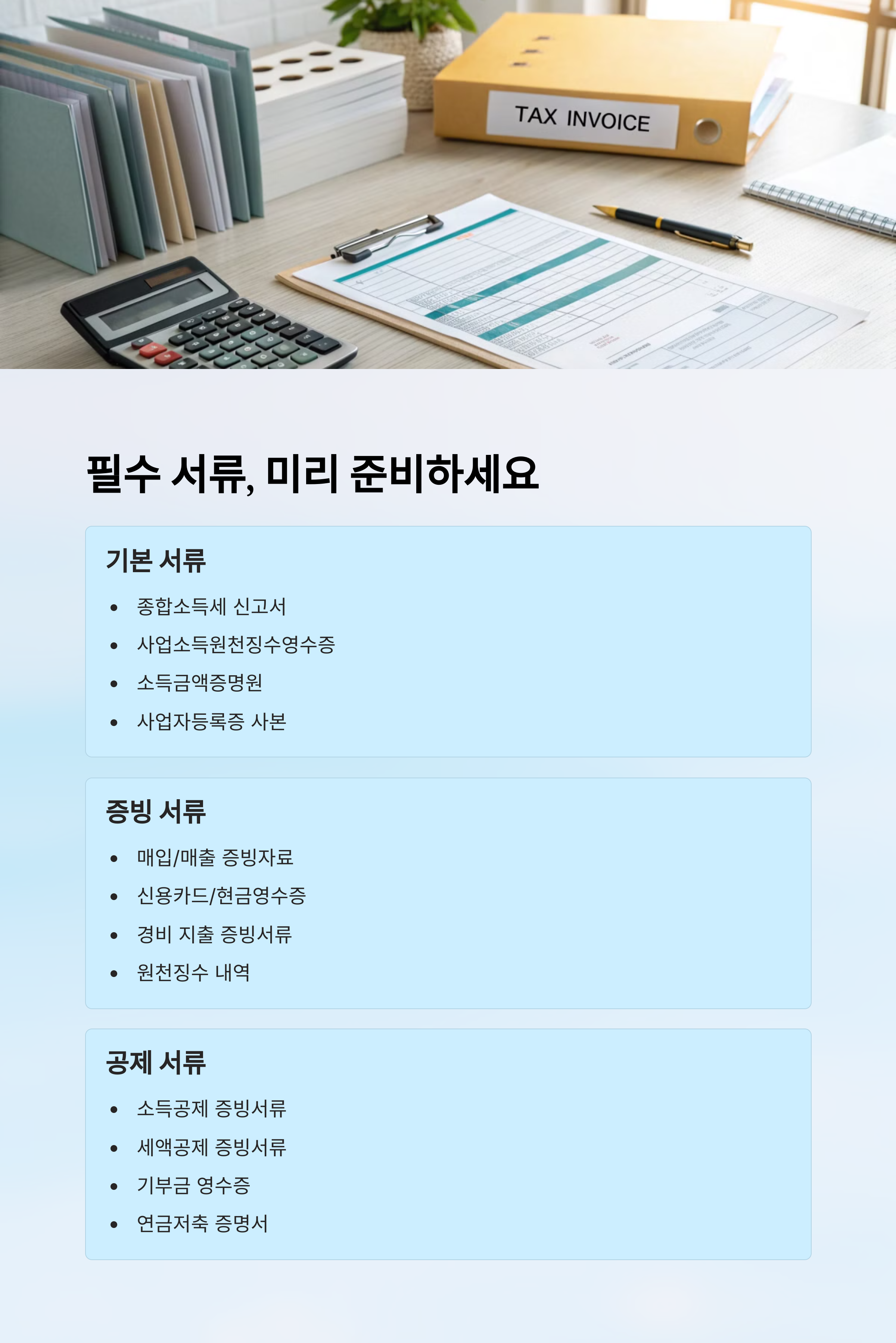 | 필수 서류 | 매출·매입 명세서, 계좌 거래 내역, 현금영수증, 카드매출 내역, 경비 증빙자료 등 |