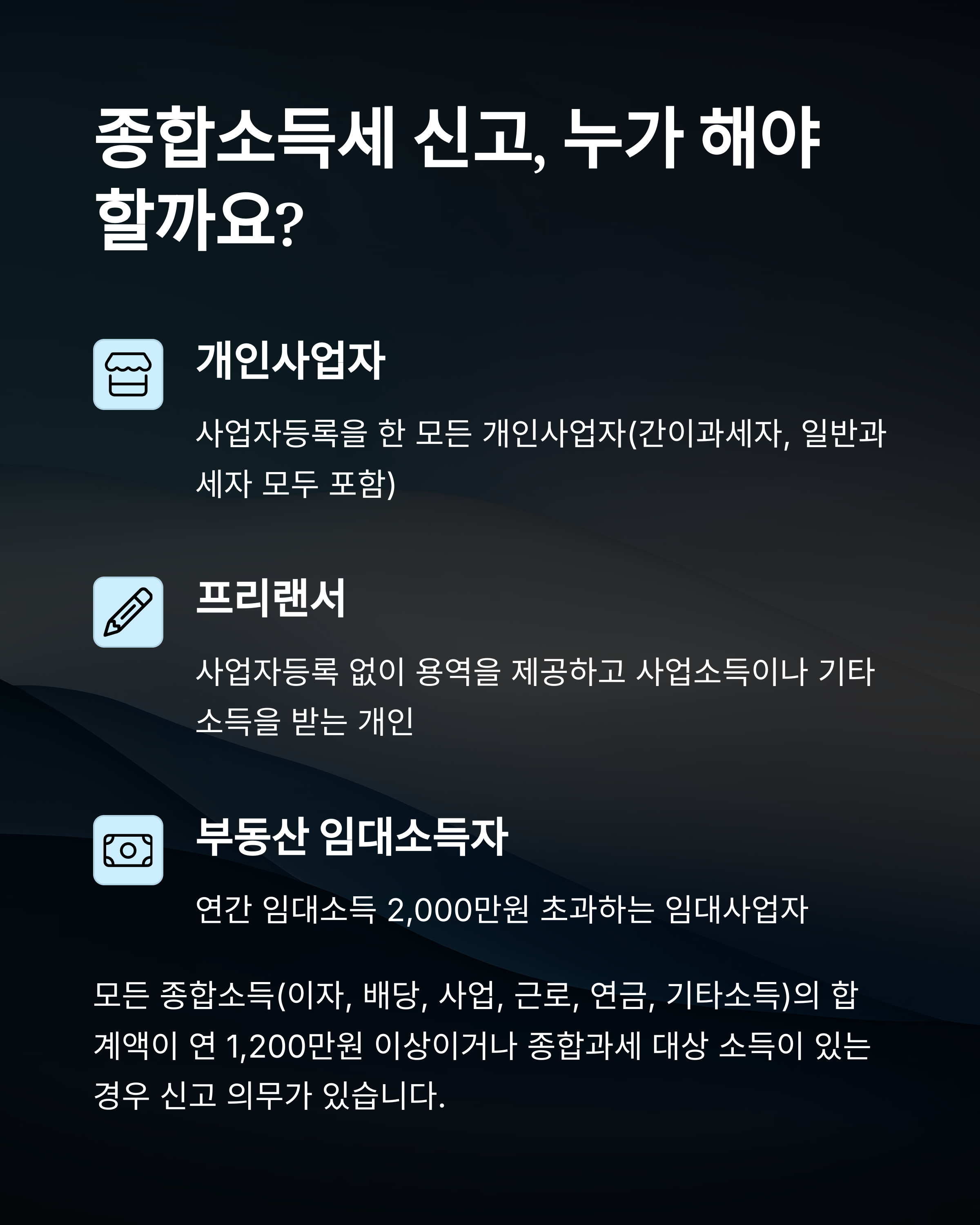 예를 들어 유튜버, 작가, 디자이너, 온라인 쇼핑몰 운영자, 부업하는 직장인까지도 일정 금액 이상의 수익이 있으면 종합소득세 대상자가 됩니다. 작년 한 해 프리랜서로 1건이라도 수입이 있었다면, 지금부터 신고 준비는 필수입니다.