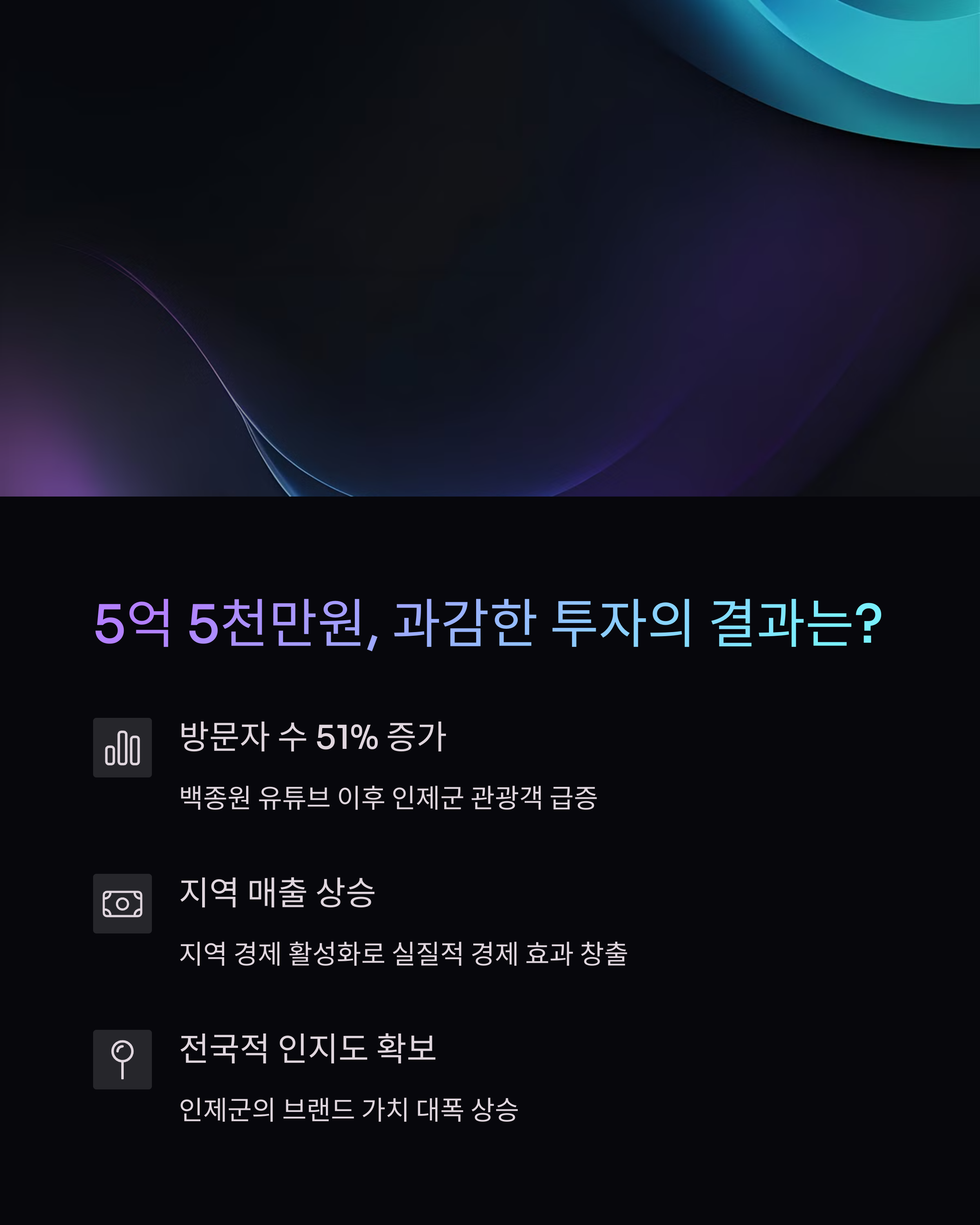 | 인제군 관광객 수 | 74,000명 | 112,000명 | +51% |