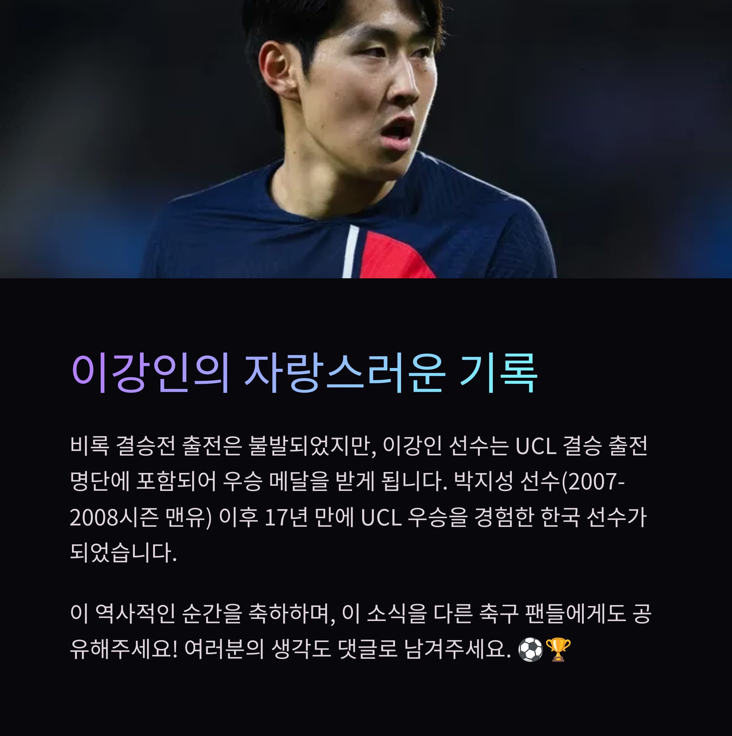 - 이강인, 박지성 이후 17년 만의 위업: 이강인 선수는 비록 결승전에 출전하지 못했지만, 팀의 우승으로 박지성 선수(2007-2008시즌 맨유) 이후 17년 만에 UCL 우승을 경험한 한국 선수가 되었습니다.