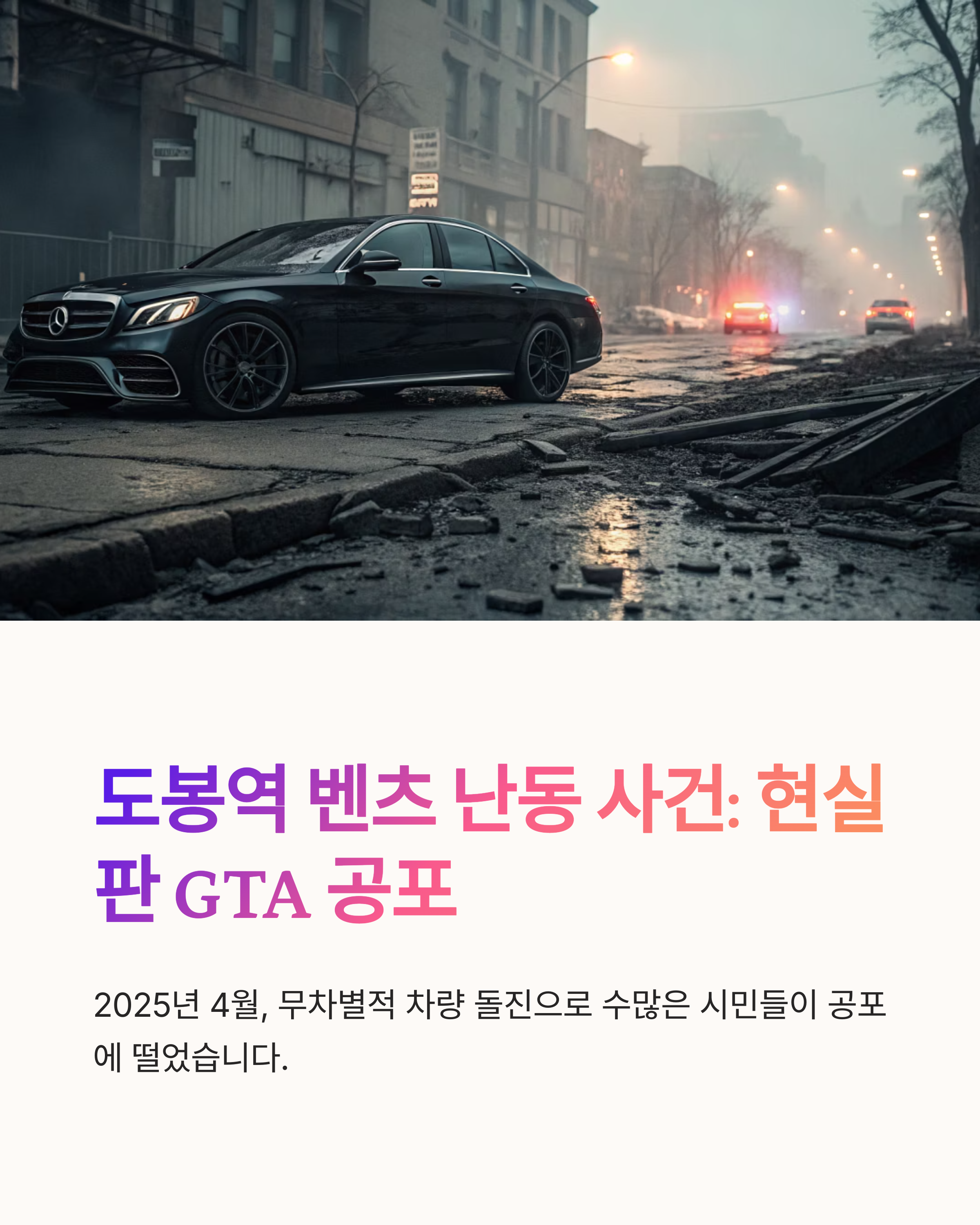 2025년 4월, 도봉역 일대에서 벌어진 ‘벤츠 차량 난동 사건’이 SNS와 커뮤니티를 뜨겁게 달구고 있습니다. 마치 게임 GTA를 연상시키는 수준의 돌진, 충돌, 인도 질주 장면이 그대로 CCTV와 목격자 영상으로 퍼지며 “현실판 GTA 사건”으로 불리고 있죠.
