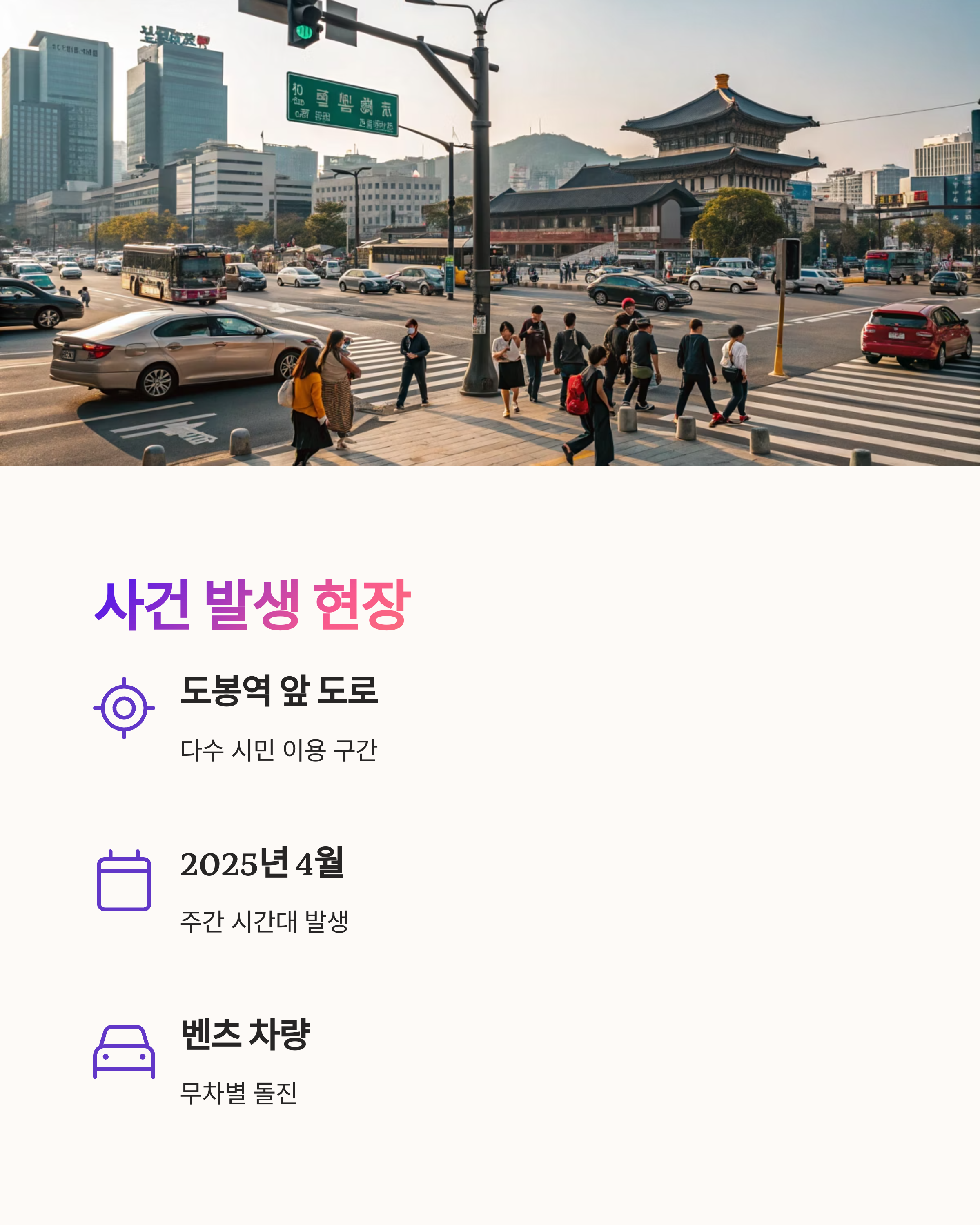2025년 4월 15일 오후 5시경, 서울 도봉역 앞 도로에서 검은색 벤츠 차량 한 대가 보행자를 향해 무차별적으로 돌진하는 영상이 공개되어 충격을 주고 있습니다. 사건 당시 차량은 보도와 차도 경계를 넘나들며 주변 차량과 인도를 들이받았고, 총 3명의 경상자와 다수의 차량 파손 피해가 발생했습니다.