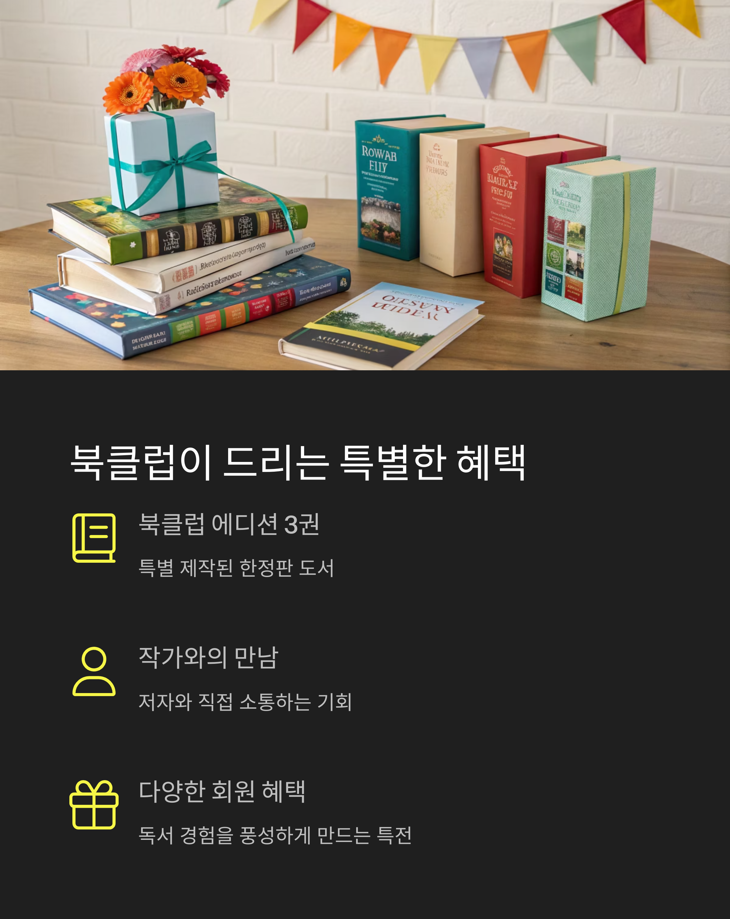 | 회원 혜택 | 회원 한정 이벤트 참여, 도서 할인 쿠폰, 작가와의 만남 기회 |